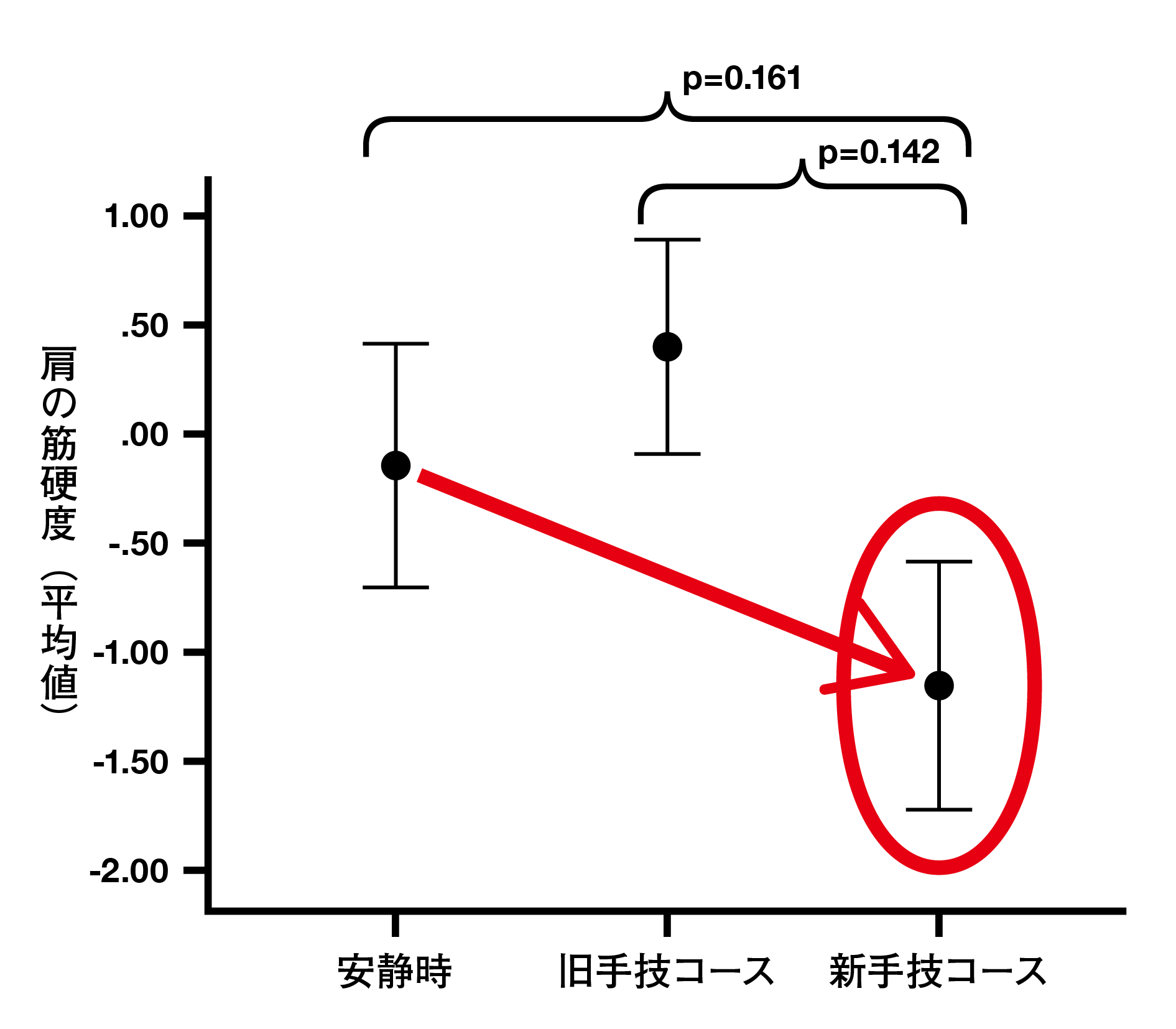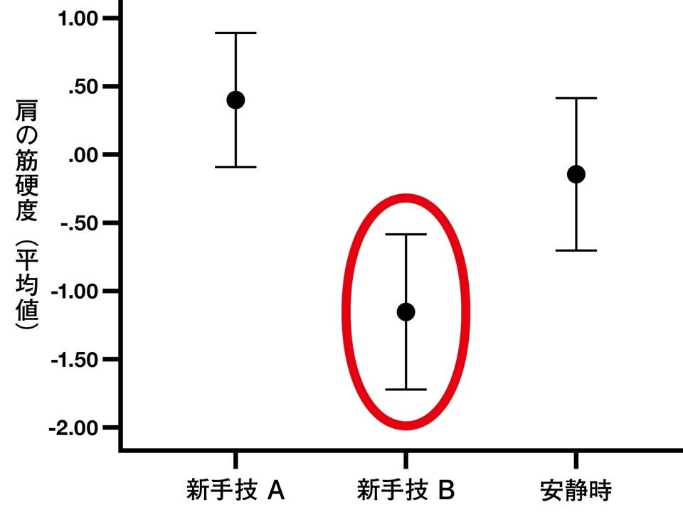 この手技では、新手技Bの後に、背中の筋硬度の緩和が見られた。