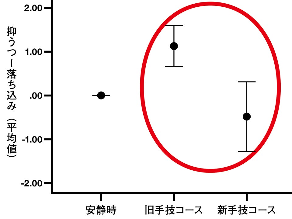 心理面においては、「抑うつ・落ち込み」は、旧手技コースに対し、新手技コースに減少の有意傾向が見られた。