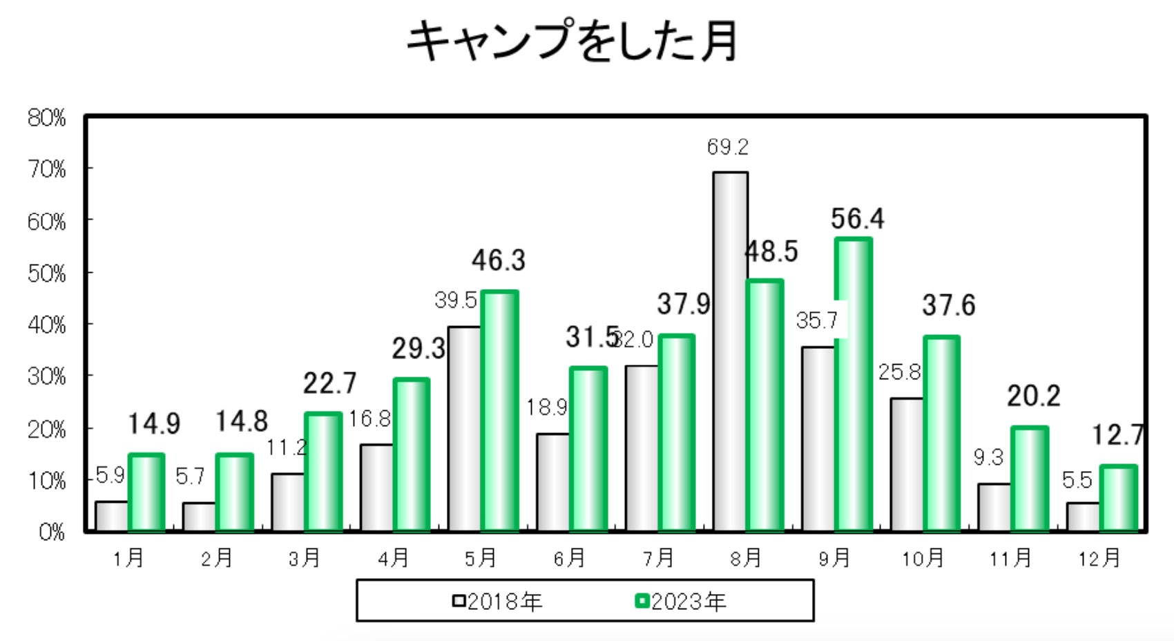 ●「キャンプをした月」を2018年と比較したもの。かつて夏休みの8月が突出していたが近年は9月がトップに。また秋から冬のキャンプも伸びている様子がわかる。