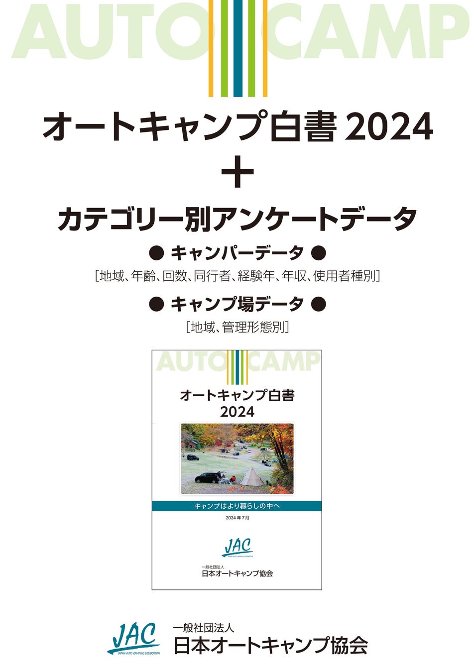 ■書籍版書名 「オートキャンプ白書2024-キャンプはより暮らしの中へ」 発売 協会ウェブサイトから発売ページ数 112ページサイズ A4判価格 7,200円+税