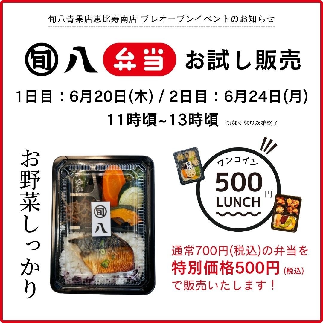 旬八青果店が恵比寿エリアに出店するのは初めて。いち早く地域の皆様にお店の存在を知っていただけるよう、プレオープンイベントとして6/20(木)と6/24(月)の2日間、ランチタイムに旬八弁当のお試し販売会を実施いたします。