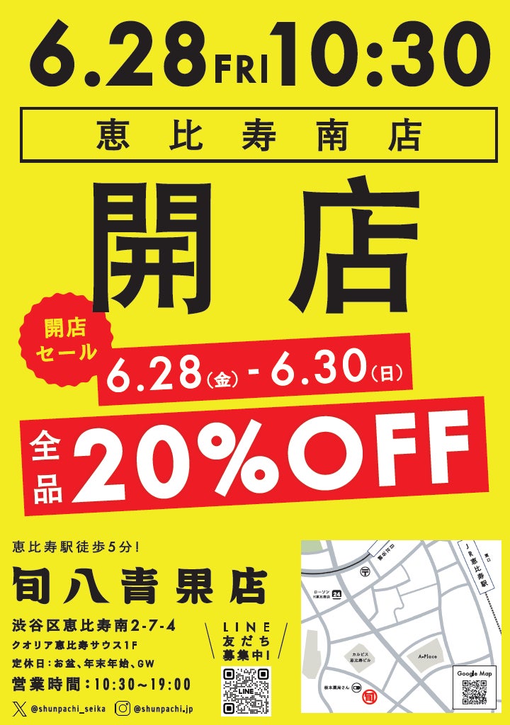 都市型八百屋「旬八青果店」が恵比寿エリアに初出店。"旬八青果店恵比寿南店"、6月28日にオープン!
