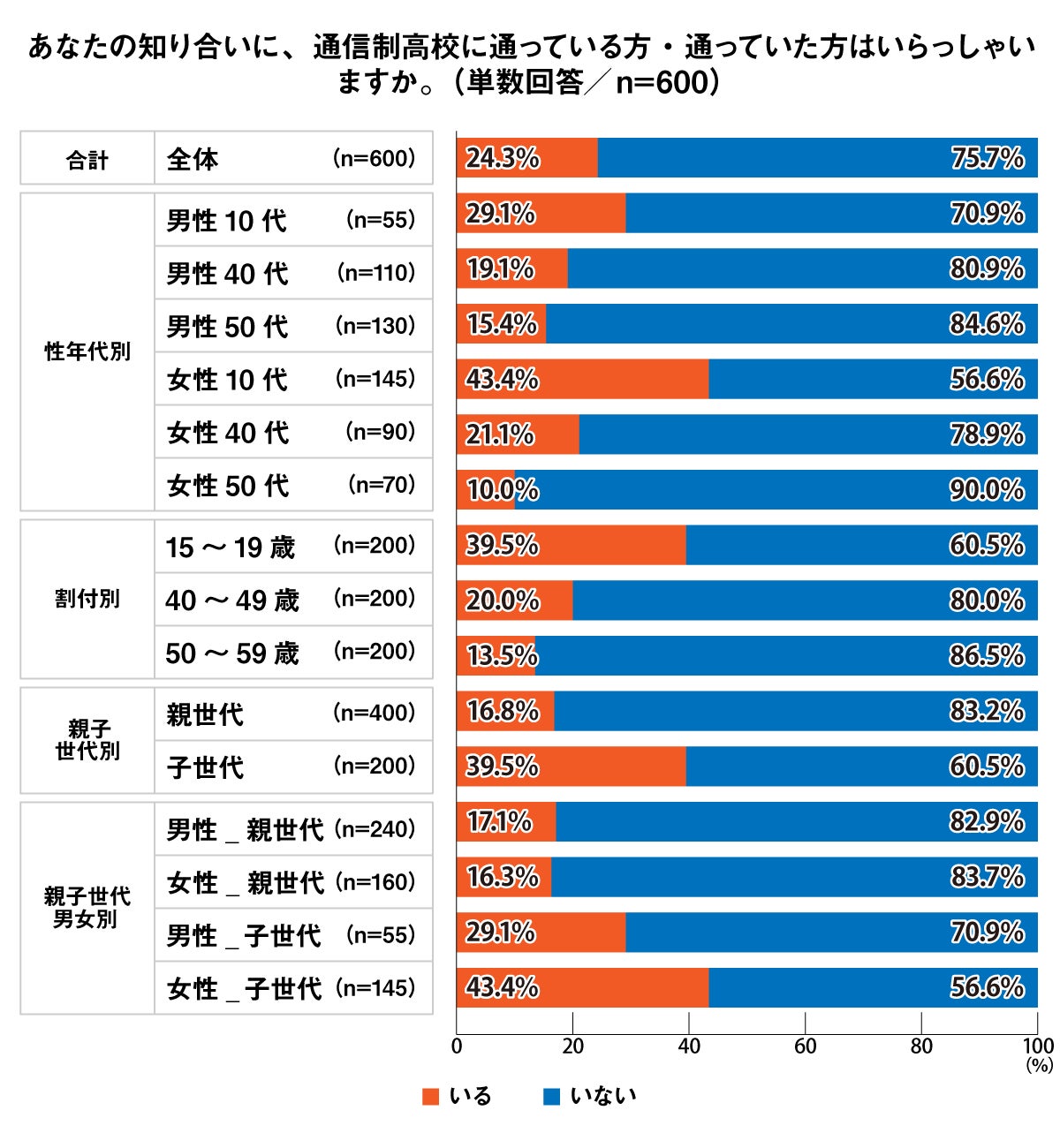 知り合いに通信制高校に通っている・通っていた人が「いる」との回答は全体の24.3%。10代では39.5%と高く、子世代は通信制高校を身近に感じていることが分かる。