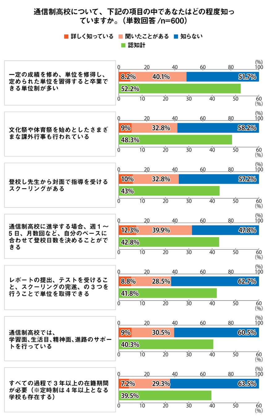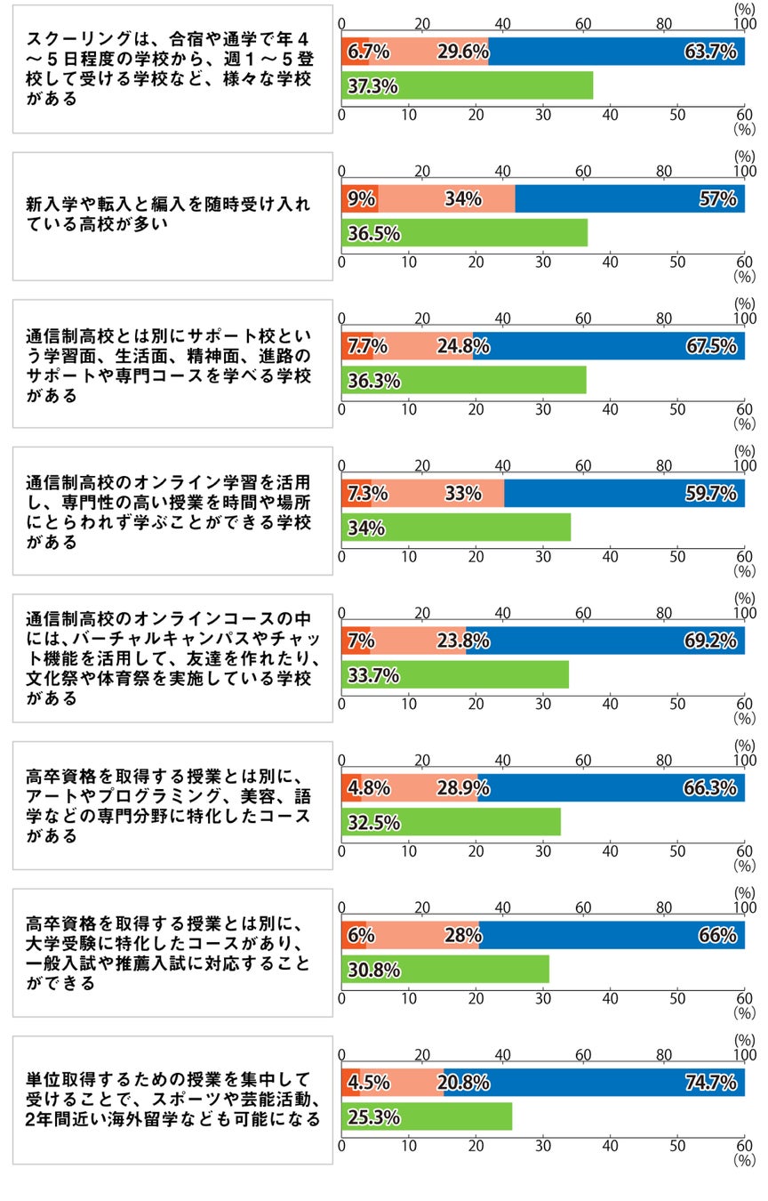 通信制高校の仕組みについては「週1~5日、月数回など、自分のペースに合わせて登校日数を決められる」(52.2%)と認知されている一方、専門分野に特化したコースの存在などは認知度が低い結果に。