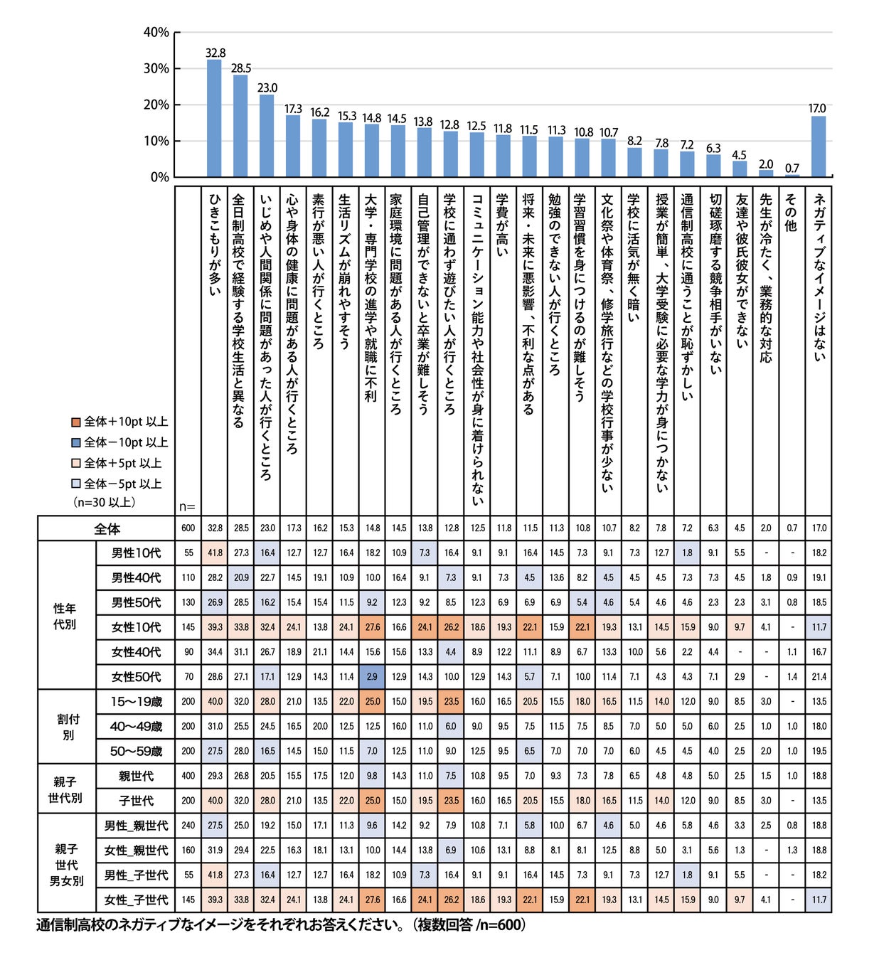 ネガティブなイメージは「ひきこもりが多い」が最も高く32.8%です。次いで「全日制高校で経験する学校生活と異なる」が28.5%、「いじめや人間関係に問題があった人が行くところ」が23.0%、「心や身体の健康に問題がある人が行くところ」が17.3%と続いています。