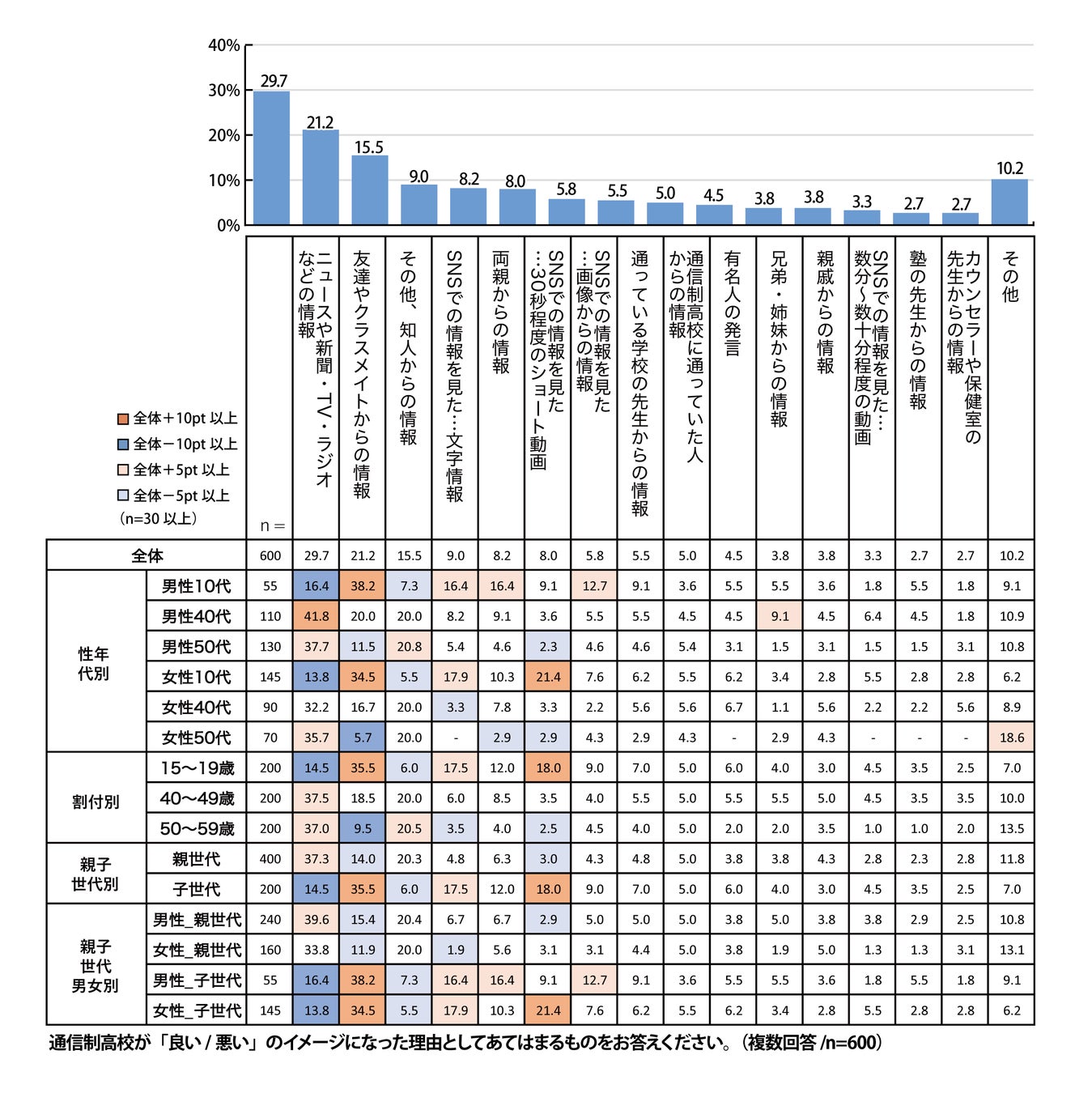 通信制高校のイメージの理由について、最も高いのは、「ニュースや新聞・TV・ラジオなどの情報」で29.7%です。次いで「友達やクラスメイトからの情報」が21.2%、「その他、知人からの情報」が15.5%、「SNSでの情報を見た…文字情報」が9.0%と続いています。この設問は親子世代別の回答に大きな差があり、親世代と子世代で情報の取り方が違うことが見て取れます。