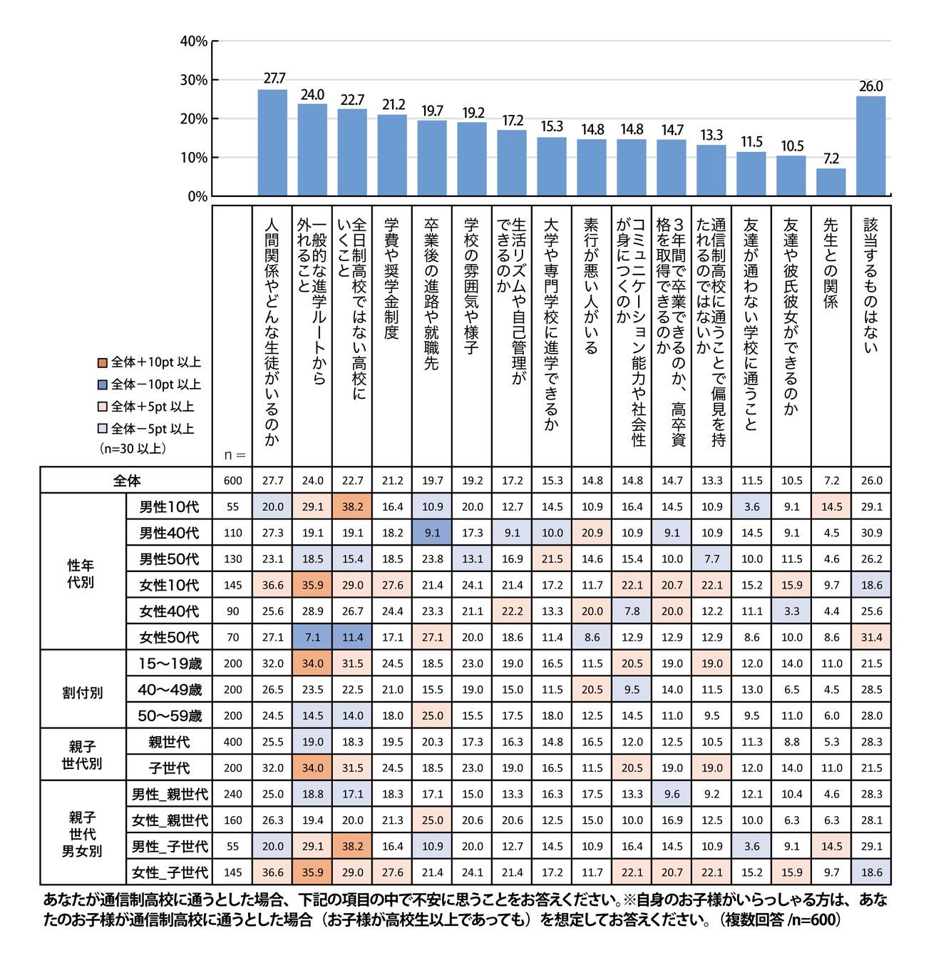 不安に思うことで最も高いのは「人間関係やどんな生徒がいるのか」で27.7%です。次いで「一般的な進学ルートから外れること」が24.0%、「全日制高校ではない高校にいくこと」が22.7%、「学費や奨学金制度」が21.2%と続いています。性年代別でみると、男性10代は「全日制高校ではない高校にいくこと」を不安視する割合が高くなっています。