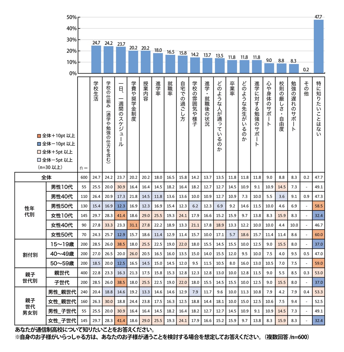 Q6「通信制高校について知りたいこと」の回答からは、全体的に学校生活や学校の仕組みについて知りたいと思っていることがわかります。中でも女性10代は通信制高校に通う生徒が身近に多く、関心度が高いためかスケジュールや授業内容、進学率などの割合が軒並み高く、「通信制高校に通うことになった場合」を自分事として考えているのではないかと推察できます。