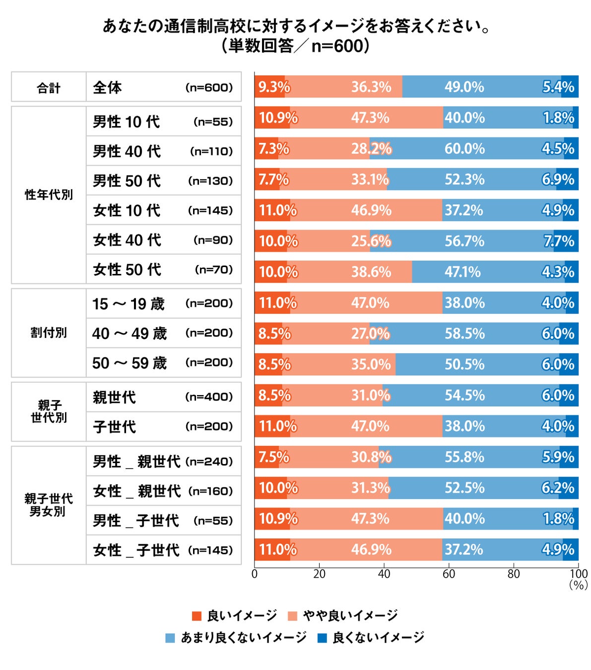 10代は身近な人が通信制高校に通うことでその存在を知り、認知が進んで、良いイメージを持っている可能性が高いと考えられます。親世代についても、いまの通信制高校のことが広く知れ渡れば、イメージが変わるのではないでしょうか。