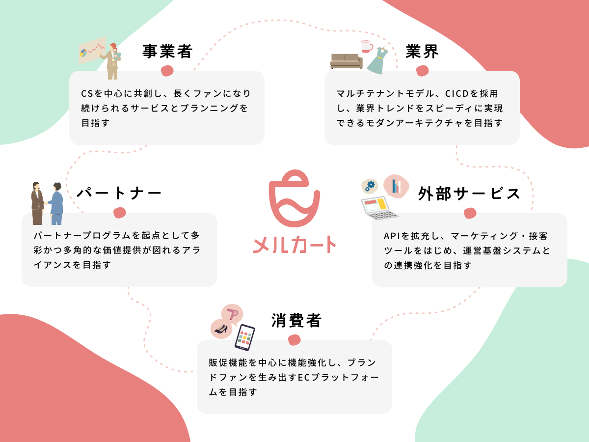 業界トレンドのスピーディな反映と同時に、事業者・消費者・多彩なサービスが密に『つながる』ECプラットフォームを目指します。