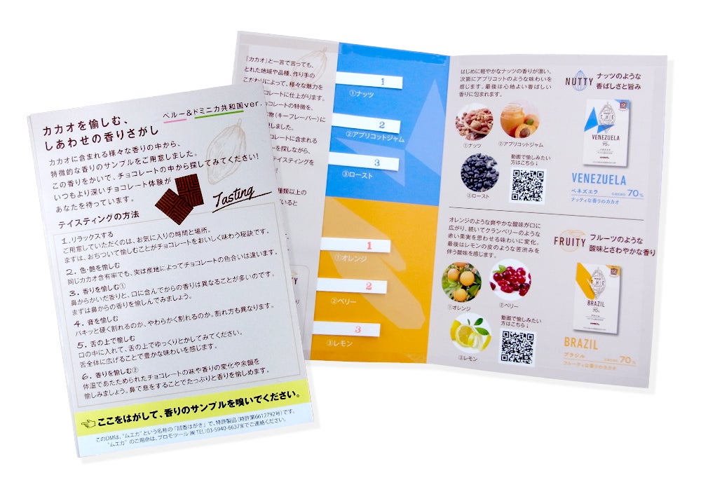 プロモツール株式会社(本社:東京都文京区、代表取締役社長:井上賢一、以下プロモツール)が開発した香りサンプルを郵送できる試香ハガキ『ムエカ』が、株式会社 明治様(代表取締役社長:松田 克也、以下、明治様)の『チョコレート検定』および『明治 ザ・チョコレートアソートセット(香り体感キット付き)』に採用されました。