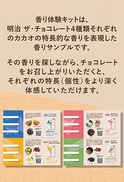 また、2016年9月に発売後1年間で約3000万枚を販売し、一大ヒット商品となった『明治 ザ・チョコレート』。現ラインナップの最大の特長は、産地によって全く異なる『ナッティ』『フルーティ』『フローラル』『スパイシー』の4つの香味。その魅力をわかりやすく伝えるために、当社の『ムエカ』を香り体感キットして採用頂き、『明治 ザ・チョコレートアソートセット(香り体感キット付き)』として好評を博しております。