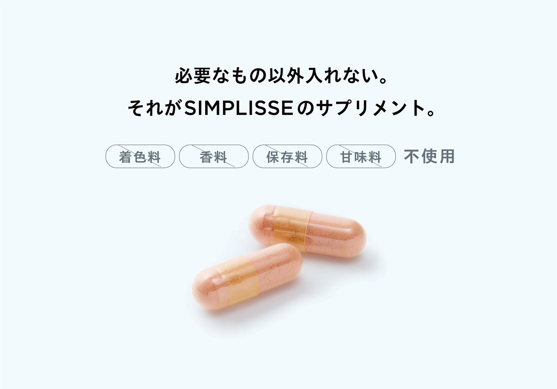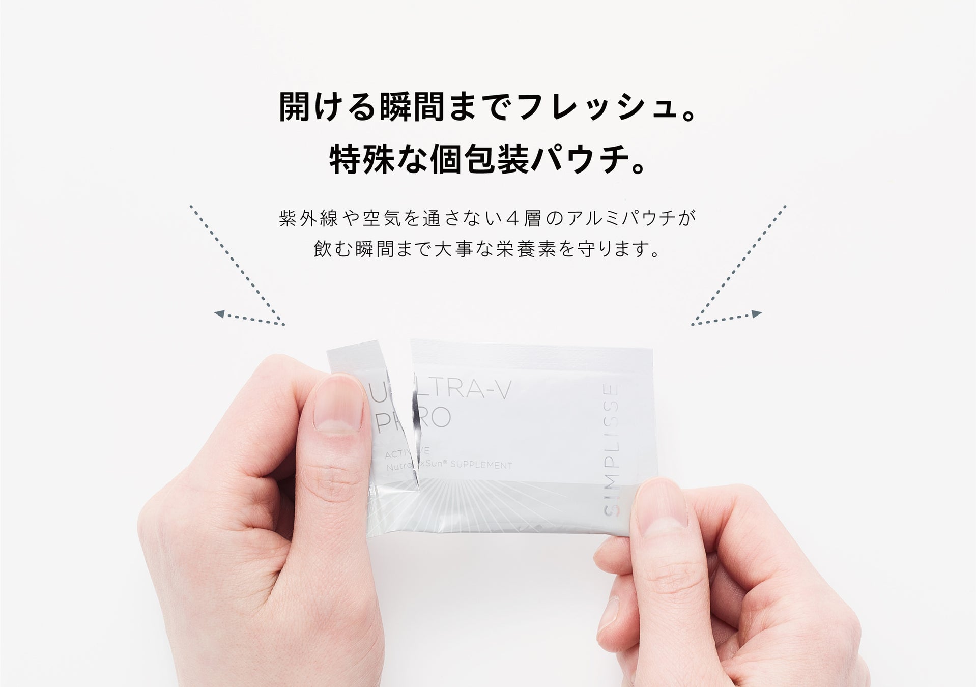 4層のアルミパウチで劣化から栄養素を守り、フレッシュなまま体内へ届けます。透明パウチやプラスチックボトルは紫外線や空気が侵入し栄養素が酸化し、壊れてしまいます。SIMPLISSEは種類の異なる4層のアルミを使用したパウチを採用。 手軽に持ち運びができる個包装のパッケージで、徹底的に栄養素を守ります。