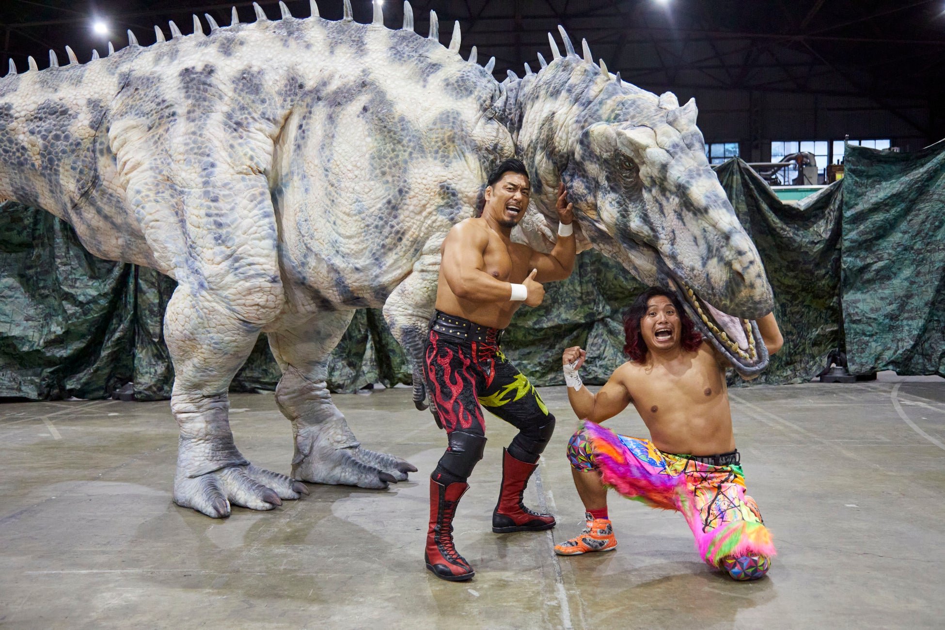 本動画では新日本プロレス所属の鷹木信悟選手と高橋ヒロム選手が全長8.2mのギガノトサウルスに遭遇!2人より遥かに大きいギガノトサウルス。猛威を振るうなか、タッチロープにあの恐竜が現れ、世紀の一戦に‼