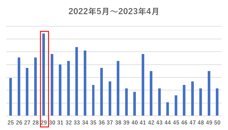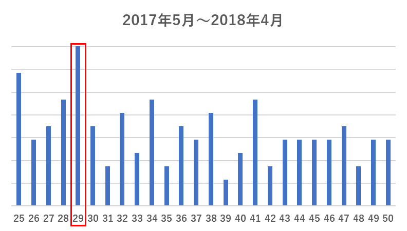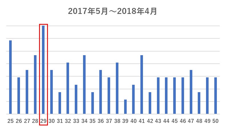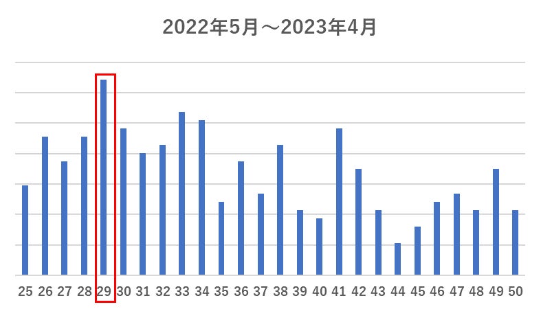 続いて、具体的な年齢を見てみました。ご入会者数がもっとも多い年齢は29歳でした。これは5年前と変わっていませんでしたが、全体的に年齢の分布が左によっていることがわかります。平均年齢も37.3歳から35.9歳へと1.4歳若くなっています。