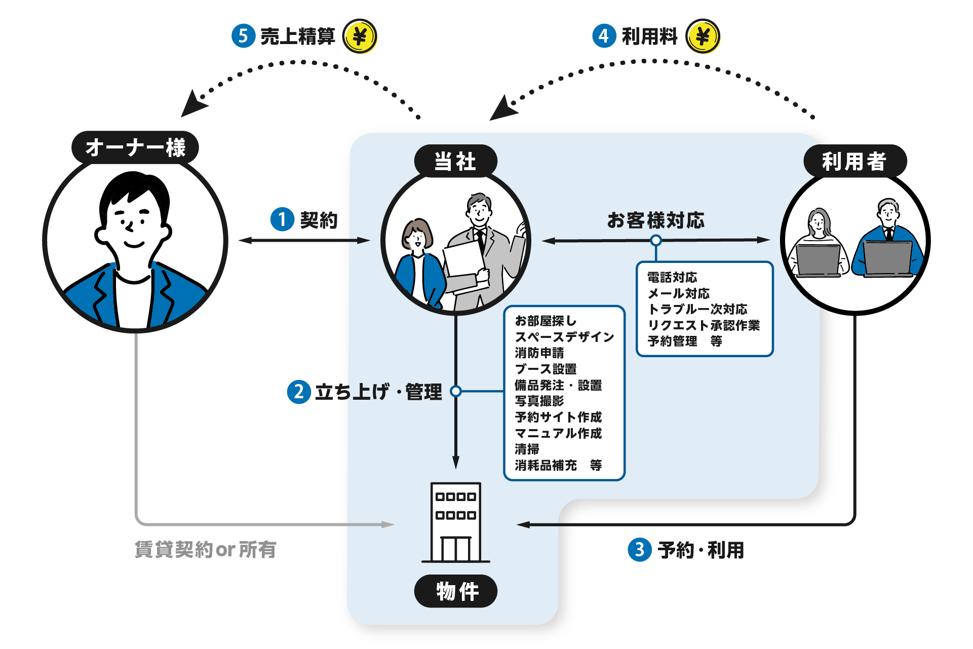 オーナー様に代わり、コインブース運用の日々の業務を代行するのはもちろん、ワークブースの仕入れ、公式予約システムの構築なども含め全て当社が支援させて頂きます。