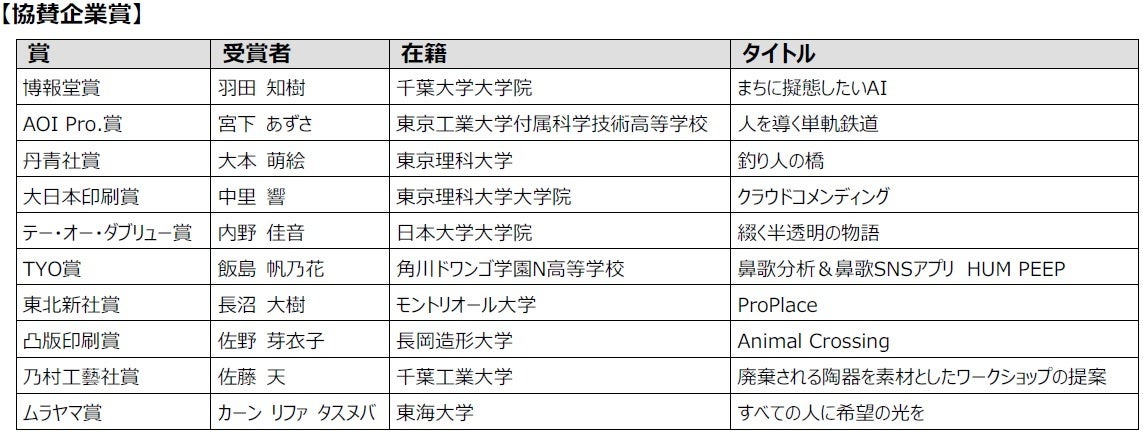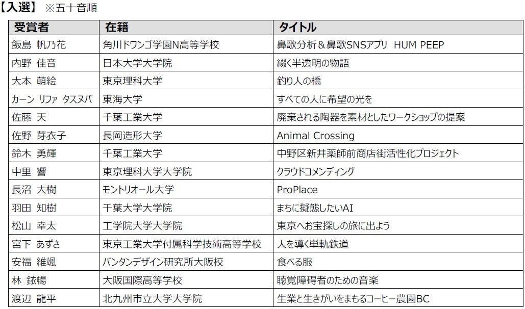 また、二次審査進出とはならなかったものの、優秀だった15名の作品を入選として表彰。その中から、JIDF協賛各社の独自選考による協賛企業賞が選出されました。