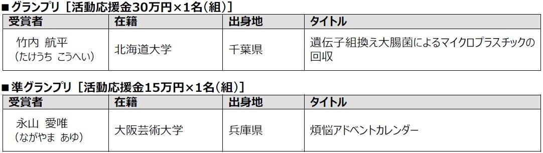 賞:グランプリ(活動応援金30万円)、準グランプリ(同15万円)、入賞(同5万円)、入選、協賛企業賞