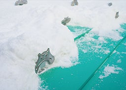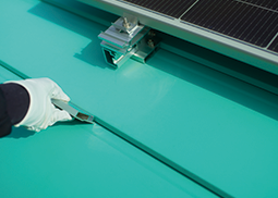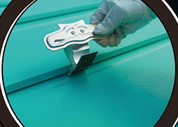 そこで、「元旦ルーフ83」では、あえてハゼに空間をつくり(名称:渦巻ハゼ)、雨水の跳ね返りを利用して汚れを排出します。さらに、ハゼ空間に金具を引っかけて雪止めや太陽電池パネルなどを屋根に穴をあけず、傷付けずに設備を設置することができます。
