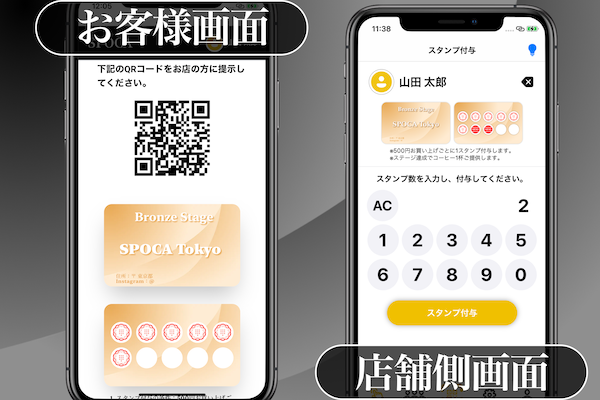 店舗側は専用アプリ(無料ダウンロード可能)でそのスタンプカード情報(QRコード)を読み込み、付与するスタンプ数を選択するだけで、お客様のスタンプカードが自動で更新されます。