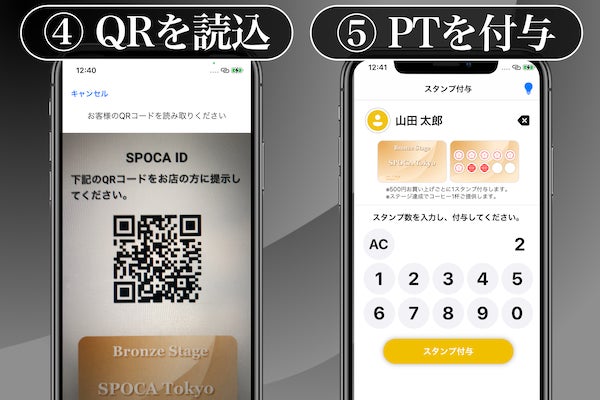 ④ お客様の来店時にお客様のSPOCA ID(QRコード)をカメラで読み込み