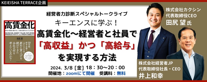 「経営者力診断スペシャルトークライブ:キーエンスに学ぶ!高賃金化〜経営者と社員で「高収益」かつ「高給与」を実現する方法」3月8日(金)18:30~開催