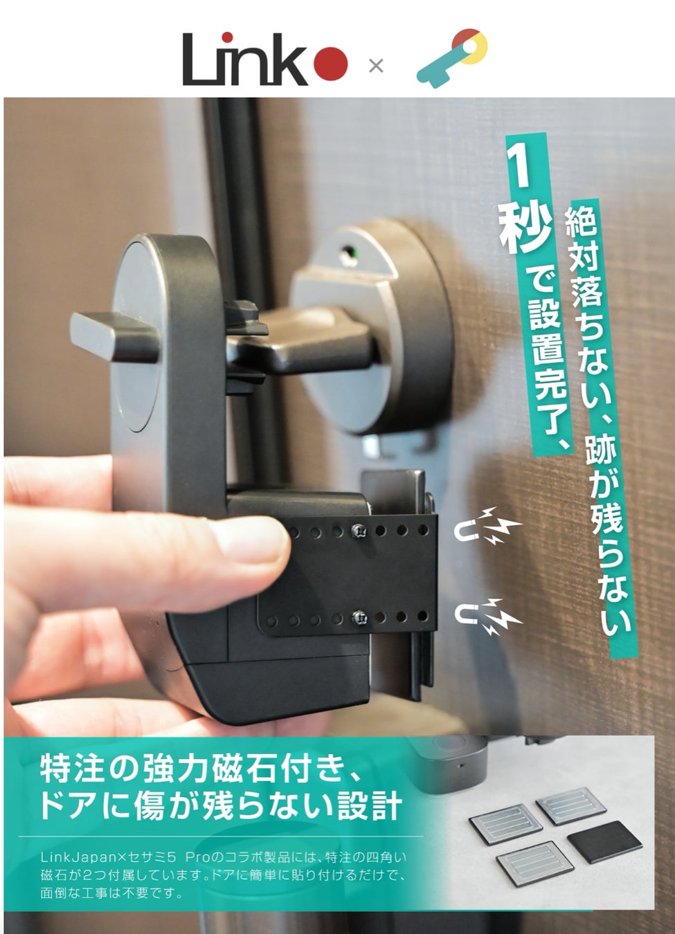 本製品は、簡易設置型スマートロック製品で主に採用されている「両面テープ固定」の課題であった、「賃貸住宅等、退去時に原状回復が必要な環境でドアを傷つけてしまう恐れがある」といった問題を解決する為に、当社がSESAMEロック専用の強力磁石を開発した国内唯一(※)のスマートロックです