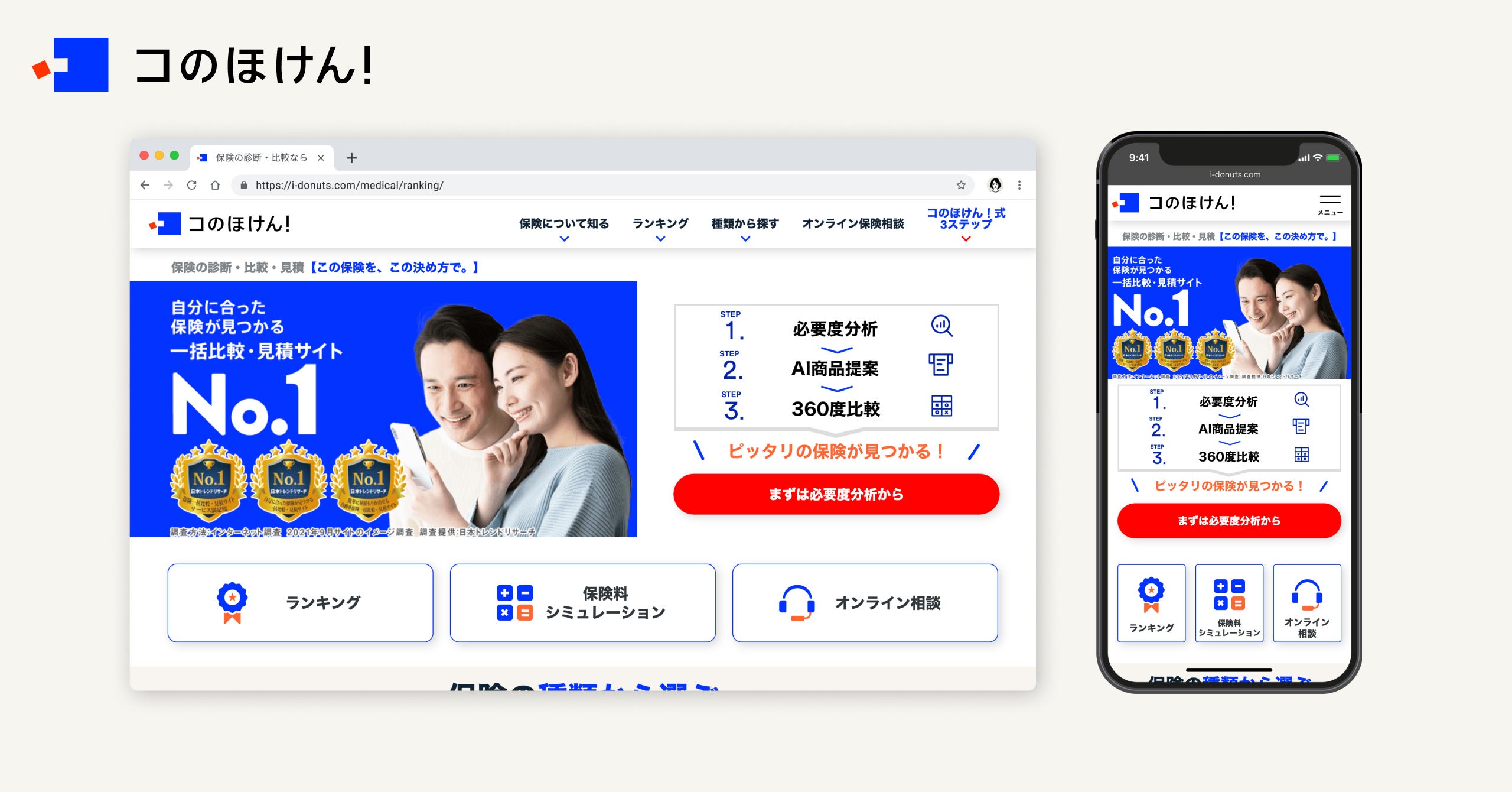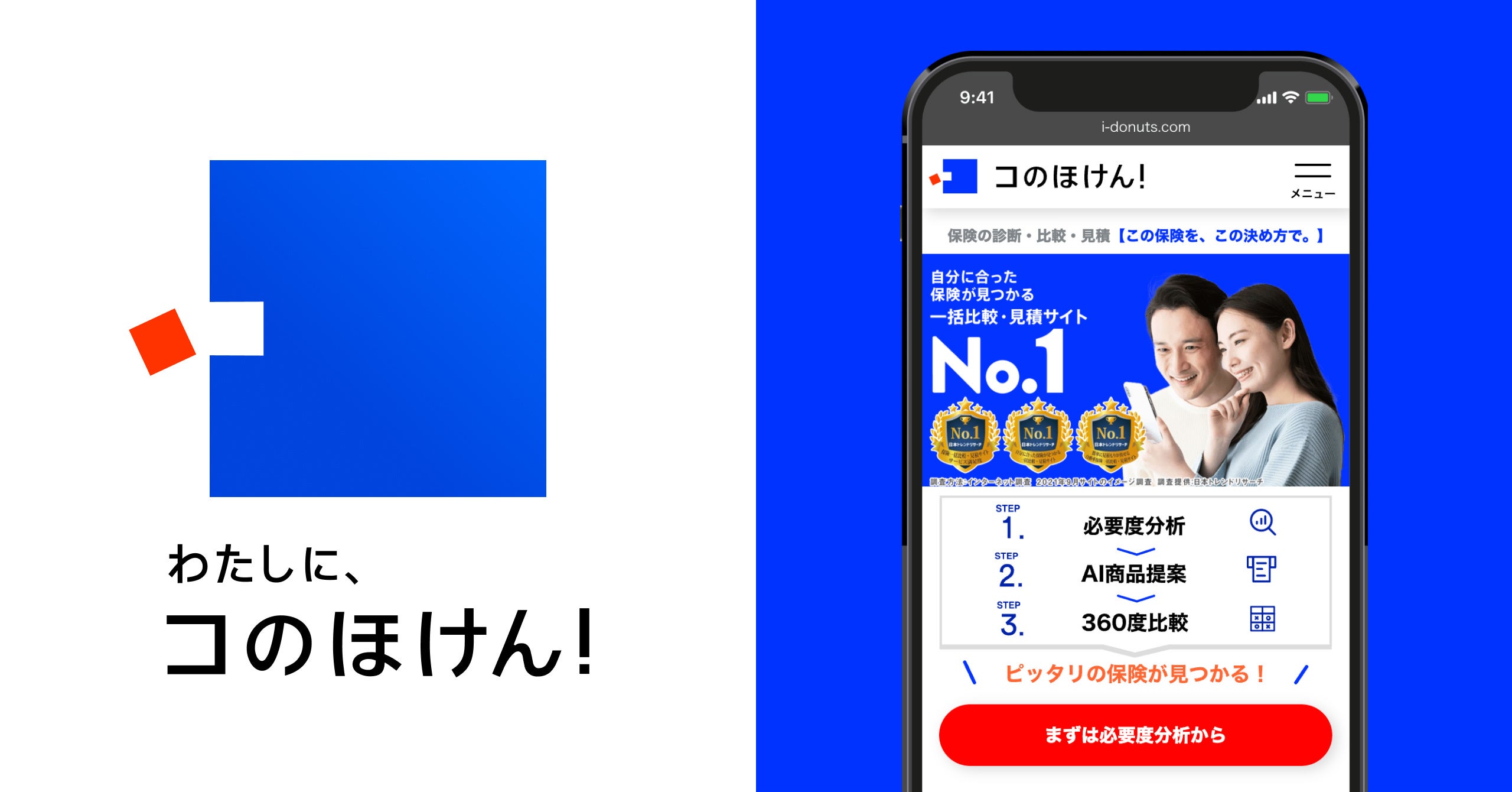 「コのほけん!」は、あなたのための、新しいオンライン保険サービス。個人ひとりひとりが「この保険に決めた!」と納得できるように、プロの知見とテクノロジーが融合したサービスです。保険の診断、比較、見積もり等、オンラインでお客様の保険選びをサポートいたします。