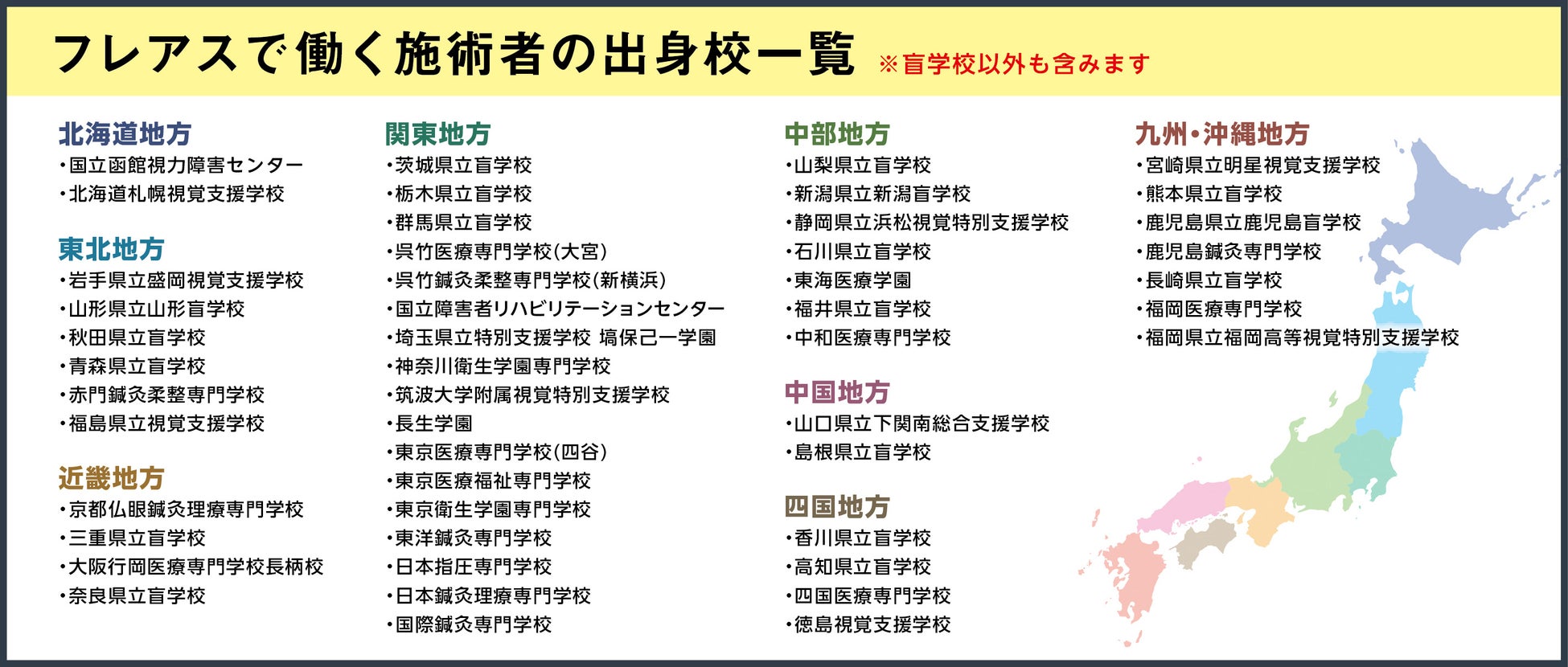フレアスで働く施術者は、車の運転やシステムへの実績登録等の事務作業が必要になりますが、視覚に障がいをお持ちの方でも就労頂けるよう、社用車の運転や軽作業を代行する専門スタッフ(社内呼称:ライトサポーター)を雇用しています。