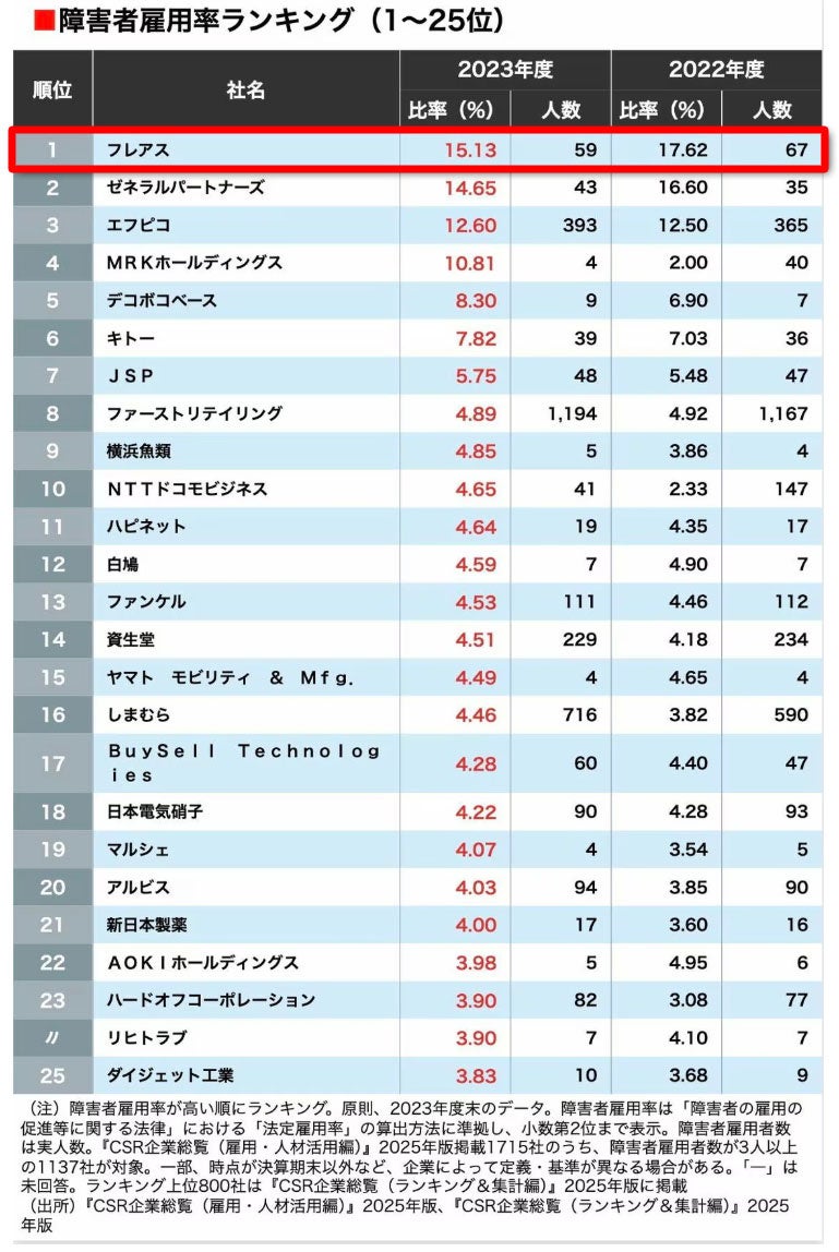 株式会社フレアス(本社:東京都品川区、代表取締役社長CEO:澤登 拓、以下「フレアス」)は、2025年に株式会社東洋経済新報社が発表した「障害者雇用率ランキング」にて、2023年度に障害者を3人以上雇用している企業1137社の中で見事1位(雇用率15.13%)を獲得しました。