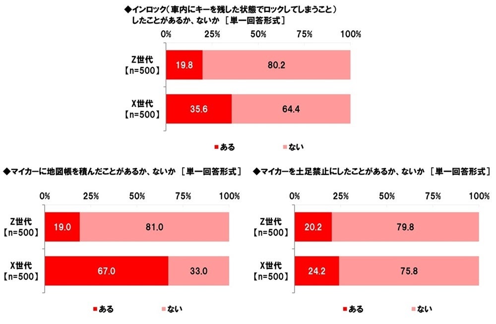 また、インロック(車内にキーを残した状態でロックしてしまうこと)したことがあるか、ないか聞いたところ、Z世代では「ある」が19.8%、「ない」が80.2%、X世代では「ある」が35.6%、「ない」が64.4%となりました。