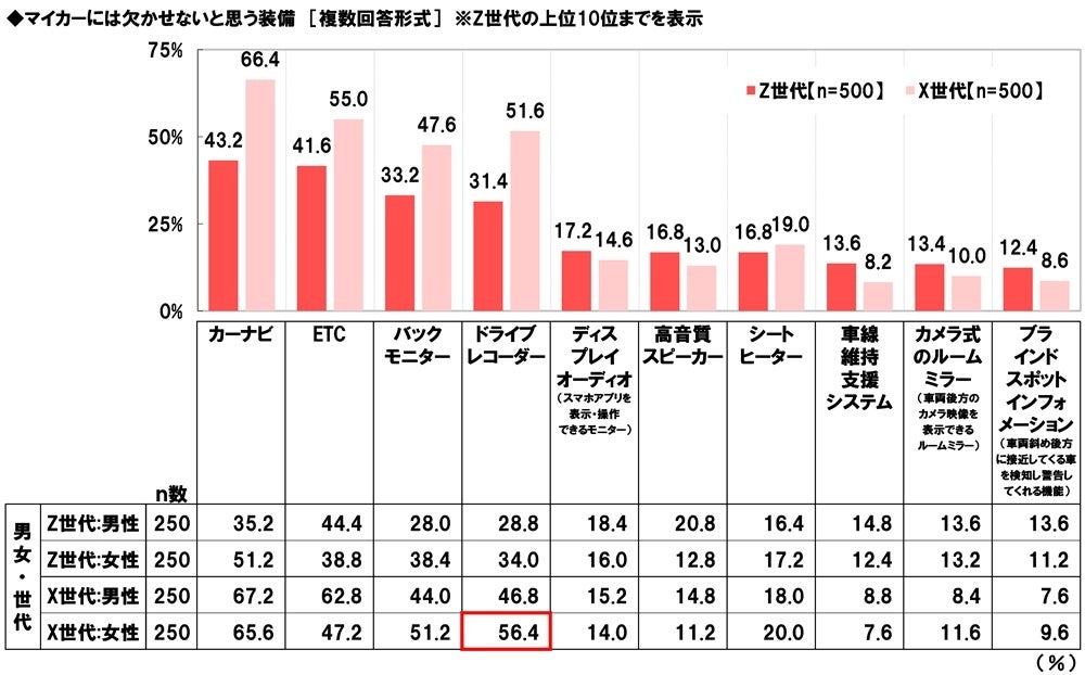 また、マイカーには欠かせないと思う装備を聞いたところ、Z世代(500名)・X世代(500名)ともに1位「カーナビ」(順に43.2%、66.4%)、2位「ETC」(41.6%、55.0%)となり、Z世代では3位「バックモニター」(33.2%)、4位「ドライブレコーダー」(31.4%)、5位「ディスプレイオーディオ(スマホアプリを表示・操作できるモニター)」(17.2%)、X世代では3位「ドライブレコーダー」(51.6%)、4位「バックモニター」(47.6%)、5位「シートヒーター」(19.0%)と続きました。