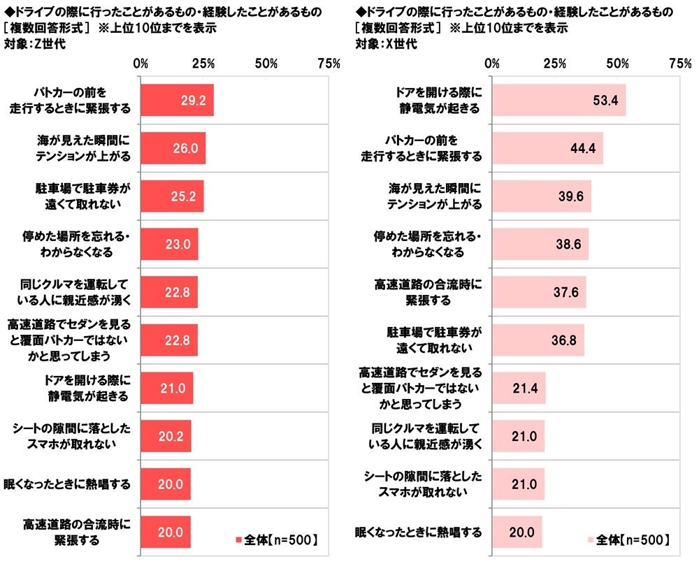 X世代(500名)では「ドアを開ける際に静電気が起きる」(53.4%)が最も高くなり、「パトカーの前を走行するときに緊張する」(44.4%)、「海が見えた瞬間にテンションが上がる」(39.6%)、「停めた場所を忘れる・わからなくなる」(38.6%)、「高速道路の合流時に緊張する」(37.6%)が続きました。