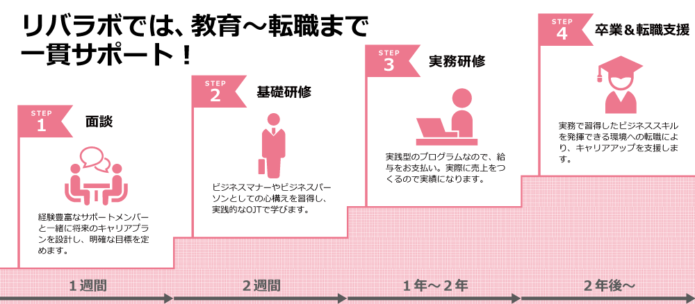 リバラボウーマンインターンシップ参加期間中は、弊社のキャリアコンサルタントが最初から最後まで、しっかりサポート。2年間の研修後は転職サポートとして、プロモーションセールス、カスタマーサクセス、インハウスセールスなど、スキルが活かせる仕事を多数ご案内しています。
