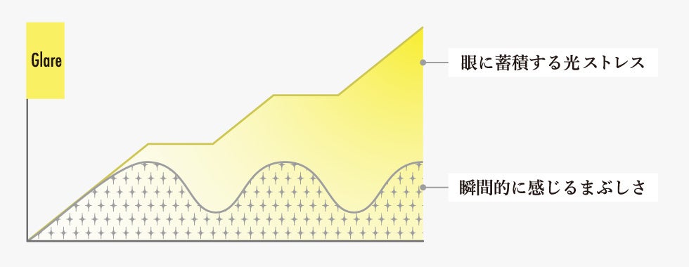 人間の眼が最もまぶしく感じる光の種類、イエローライト。それはまぶしいというストレスそのものを生じさせる光です。そのストレスは無意識に眼に蓄積し、眼病につながる大きな要因となります。特に40 代以降は眼の黄変が進みやすく、よりイエローライトによるまぶしさを感じやすくなります。