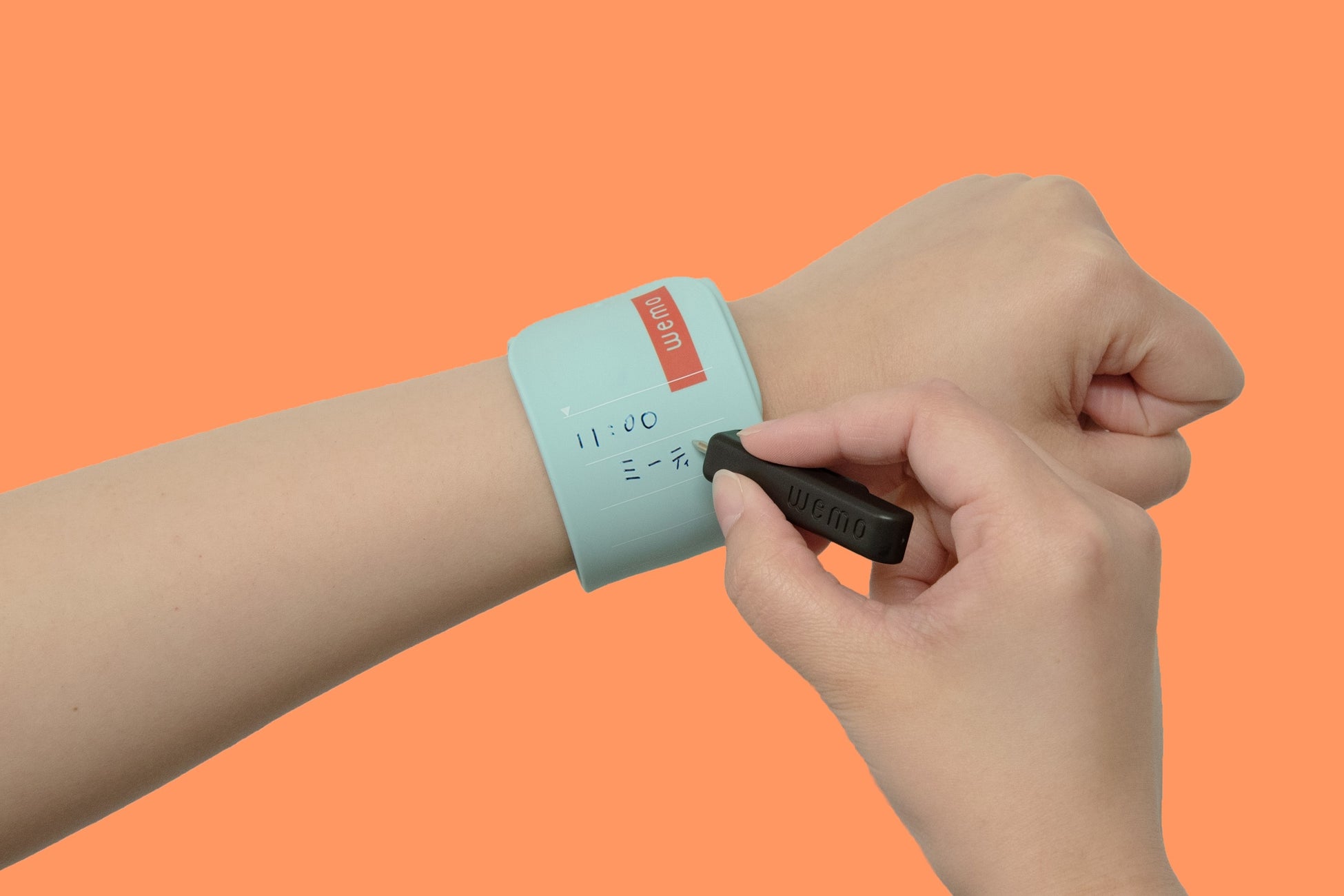 腕に巻いて使用するメモ「ウェアラブルメモwemo」は、“記憶に対するストレスを軽減する”というテーマから生まれた、油性ボールペンで書いて消しゴムで消せる“身につけるメモ帳”です。手に直接メモを書く看護師さんから着想を得て誕生したwemoは、メモをとっさに取り出せないときや、手に持つことが難しい場面でも必要な時にすぐにメモできるツールとして、看護の現場だけではなく様々な現場で2017年の発売以来ご活用をいただいております。また、メモを常に身に着けておける安心感から、記憶が困難な方のサポートツールとしても好評をいただいております。