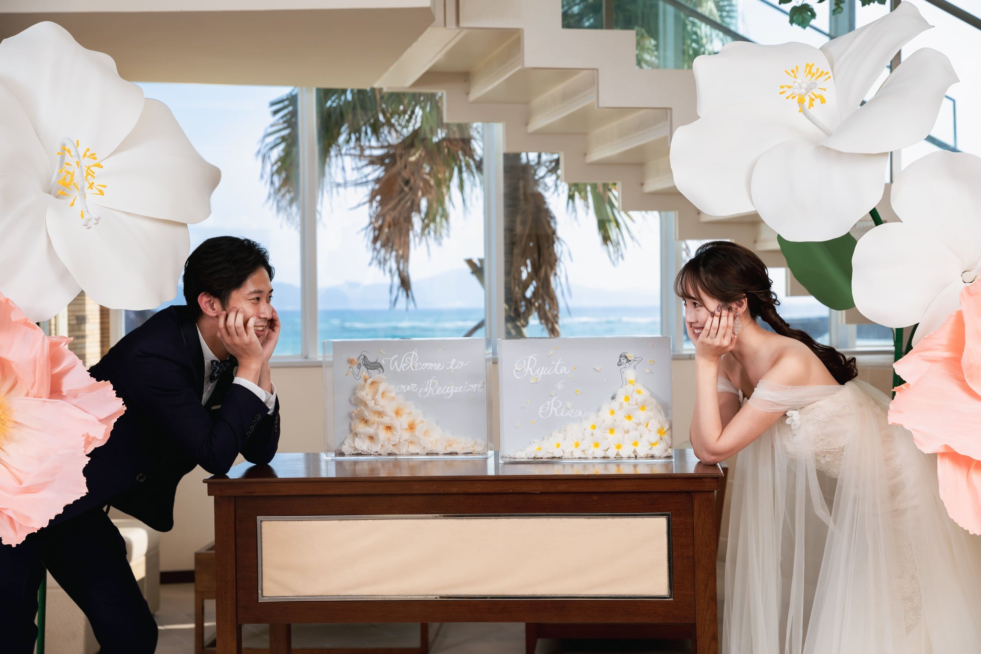 アイネス ヴィラノッツェ 沖縄のロケーションに合わせた特別な花言葉ドレス。テーマとなるお花は沖縄をイメージさせるハイビスカスとプルメリア。