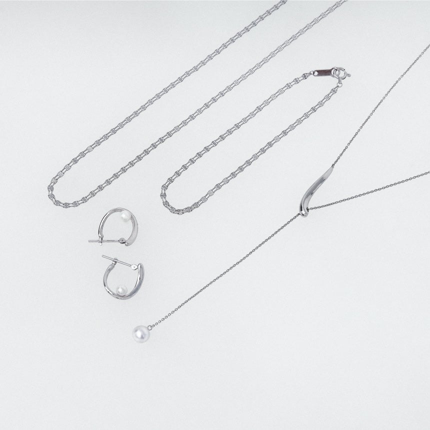プラチナとアコヤパールのネックレス¥99,000、ピアス¥94,600、チェーンネックレス¥57,200、ブレスレット¥39,600/すべてプラチナ・ウーマン 4℃