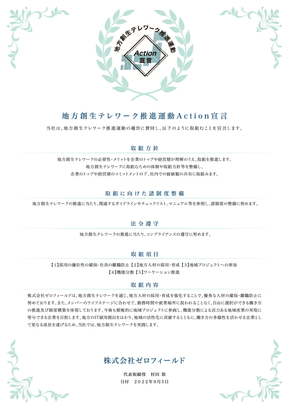 株式会社ゼロフィールド(所在地:東京都港区 代表取締役 村田敦/以下、当社)は、内閣府・内閣官房が推進する「地方創生テレワーク推進運動」の趣旨に賛同し、推進運動に参加する為「Action 宣言」を行いました。当該宣言が本日内閣府・内閣官房に正式に受理され、「地方創生テレワーク」事業のホームページに掲載されましたのでお知らせします。