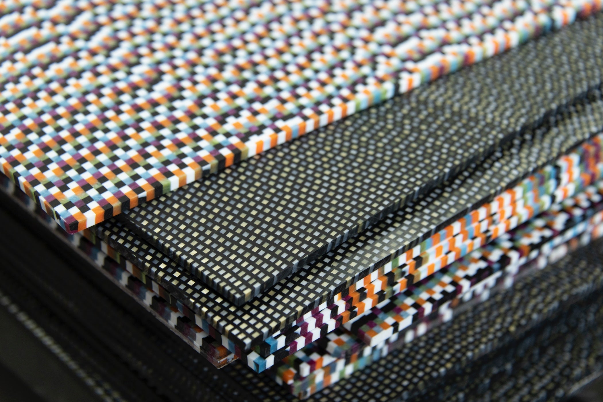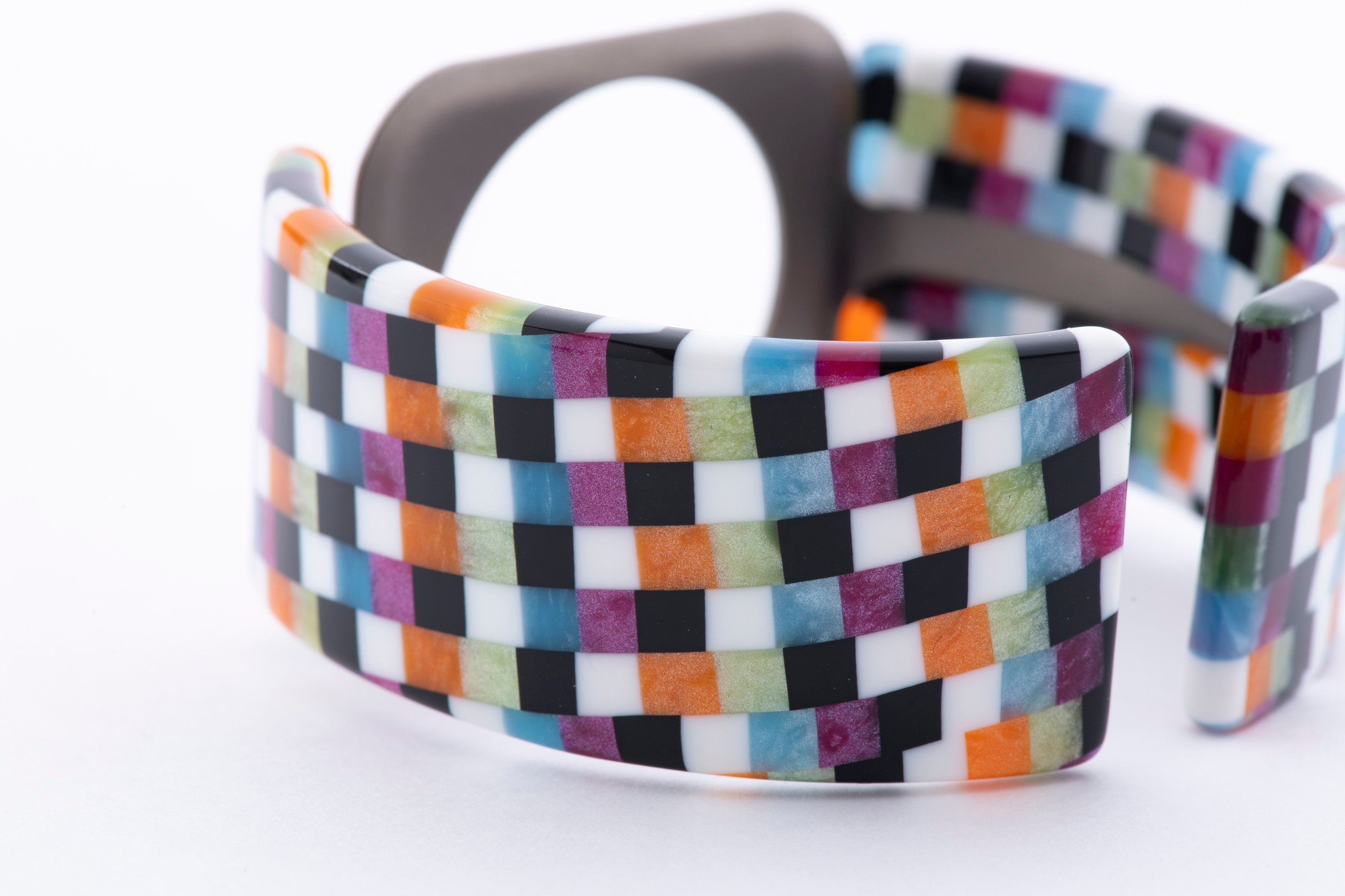 何千種類ものカラー&デザインがあふれる中から、今回は高品質のマルチな『モザイクカラー』と、金・銀メタリックの市松模様『シックラデン』をセレクト。ワンロット80kgの生地でのみ購入できる希少で美しいヴィンテージ柄から、世界にひとつだけの「Air Bangle」をつくりだしました。