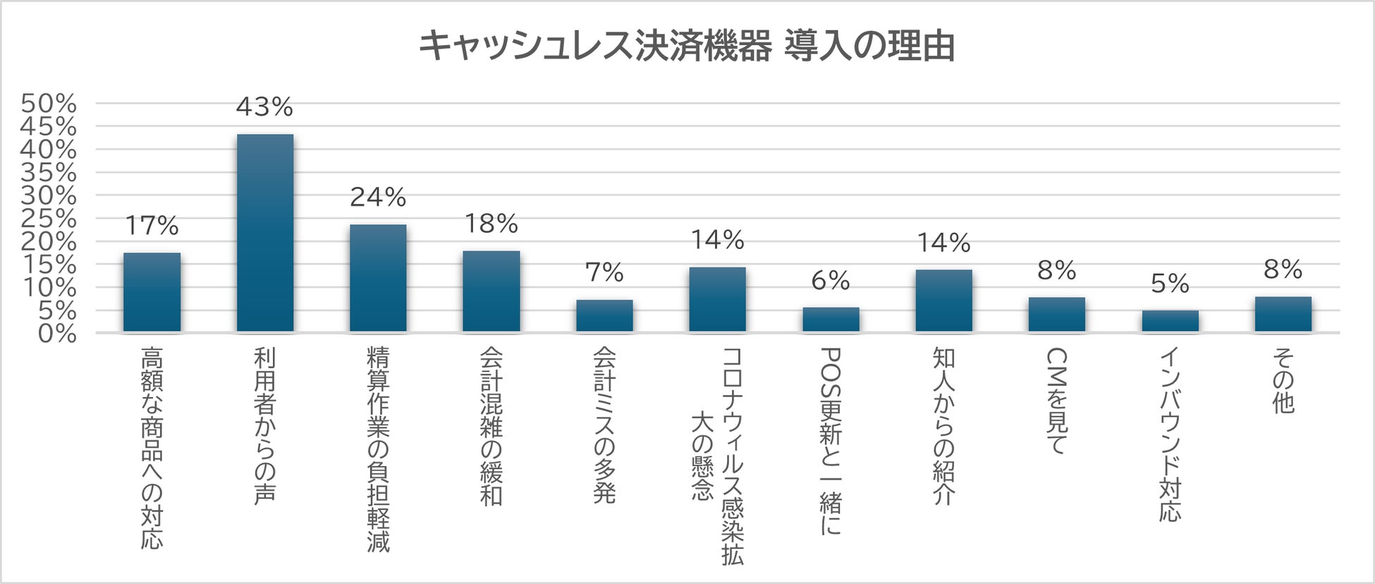 キャッシュレス決済導入の主な理由は、店舗効率化(精算作業の負担軽減(24%)、会計時の混雑緩和(18%)、会計ミス対応(7%))などに回答が集中しましたが、社会的風潮(利用者からの声(43%)、知人からの紹介(14%)、CMを見て(8%))が大きな割合を占め、キャッシュレスの機運が高まり、導入の後押しとなったことが読み取れます。