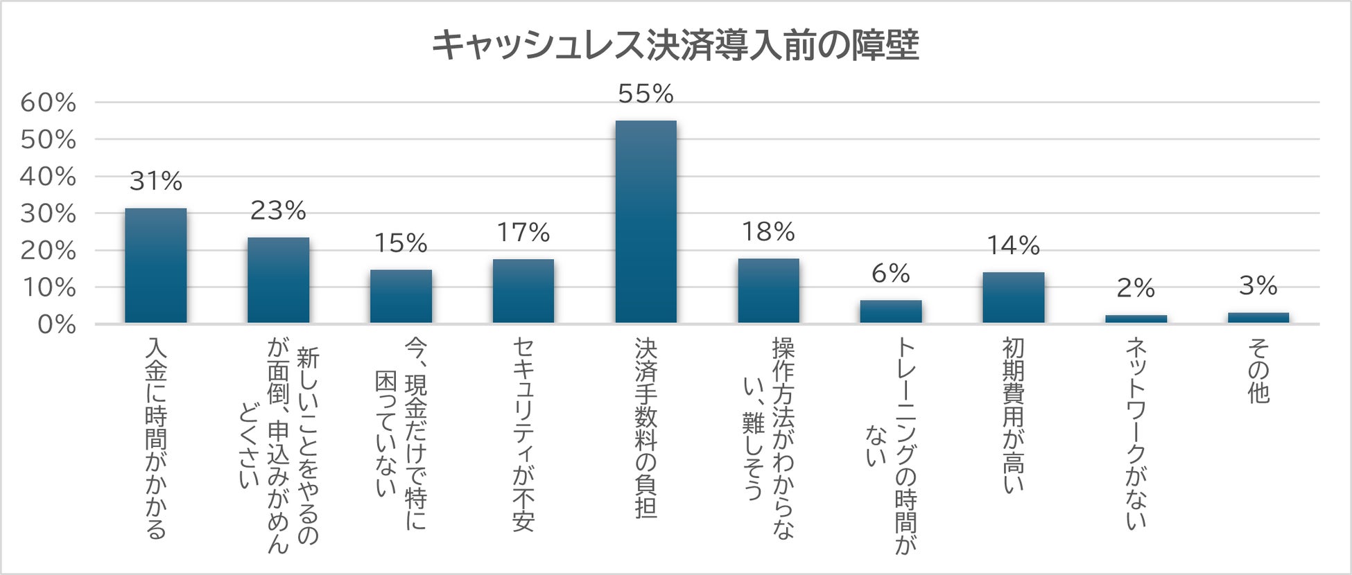 キャッシュレス決済導入前の主な障壁としては、経済的要因(決済手数料の負担(55%)、入金に時間がかかる(31%)、初期費用が高い(14%))が主たる回答となりましたが、心理的な障害(新規導入の手続きの煩わしさ(23%)、操作方法が分からない(18%)、セキュリティが不安(17%))も多くの割合を占めました。