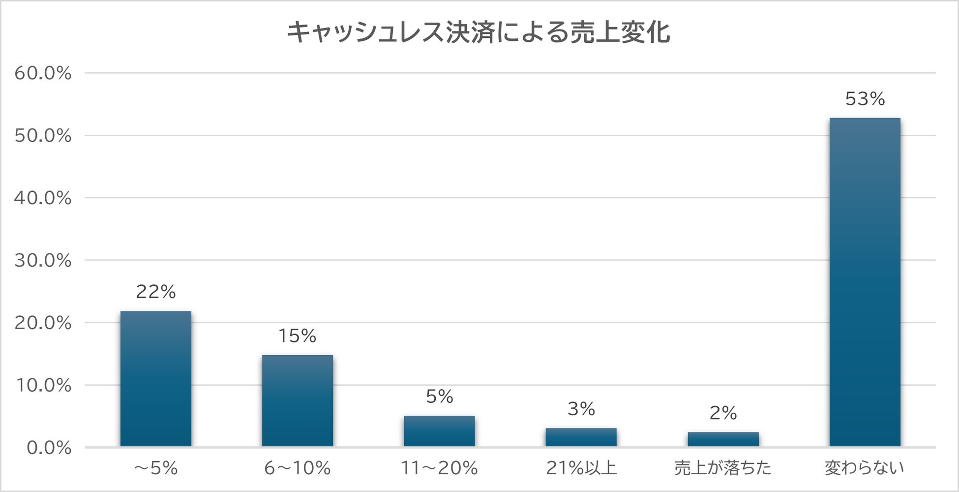 キャッシュレス導入による売上変化については、半数(53%)の事業者において売上増加を実感できていないという結果となりました。しかし、8%の事業者が10%以上の売上増加を感じており、5%以上の売上増加を感じた事業者は、23%に上っています。キャッシュレス導入によって少しでも売上増加を感じている事業者は45%という結果となりました。
