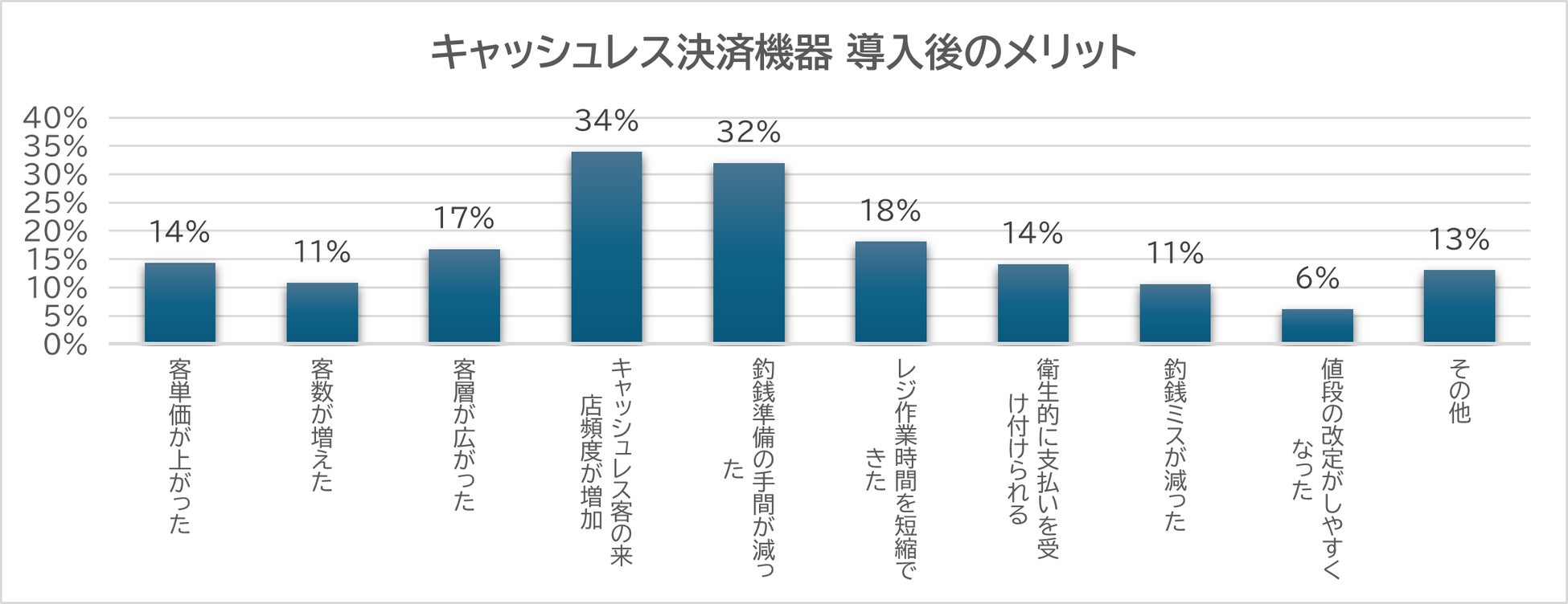 キャッシュレス決済導入後のメリットとしては、増客・売上効果(キャッシュレス客の来店頻度増加(34%)、客層の拡大(17%)、客単価が上がった(14%)、客数が増えた(11%))と、店舗効率化(釣銭準備の手間削減(32%)、レジ作業時間の短縮(18%)、釣銭ミスの減少(11%))に、回答が集中しました。