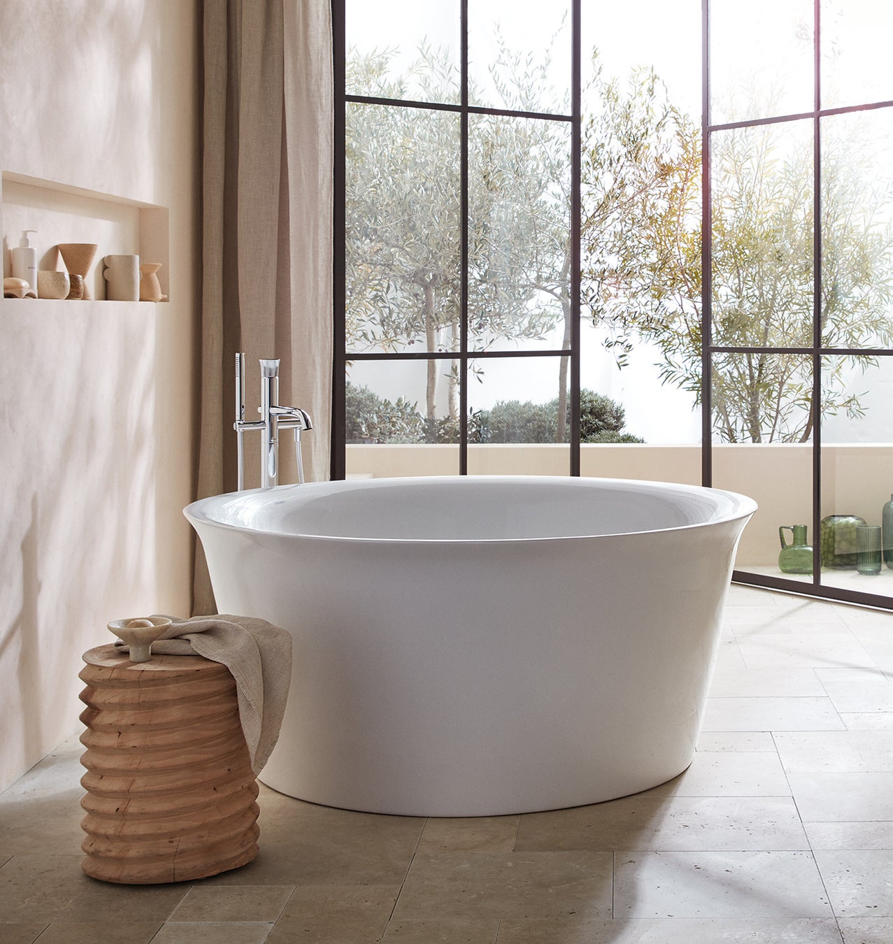 シルエットを揃えたシームレスなアクリル製フリースタンディングのバスタブにも本シリーズのデザインランゲージが反映されています。ゆったりとした直径1400mmのラウンド型のバスタブは、バスルームのアイキャッチにも最適です。また、オーバル型は1800x900mmとコンパクトな1600x800mmの2つのサイズからセレクトいただけます。