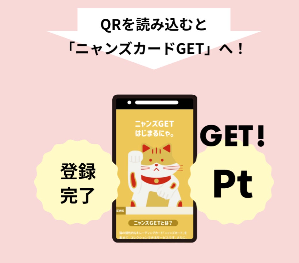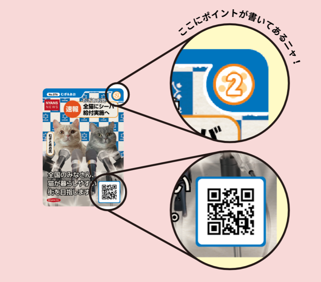 ニャンズカードのQRコードを読み込むと専用サービス「ニャンズカードGET」が開き、ニャンズカード図鑑としてデジタル上で自分が獲得したカードのアーカイブを楽しんだり、カード画像をSNSでシェアしたりすることができます。そして、ニャンズカードをGETすることでニャンズカードのポイントを集めて景品に応募が可能です。