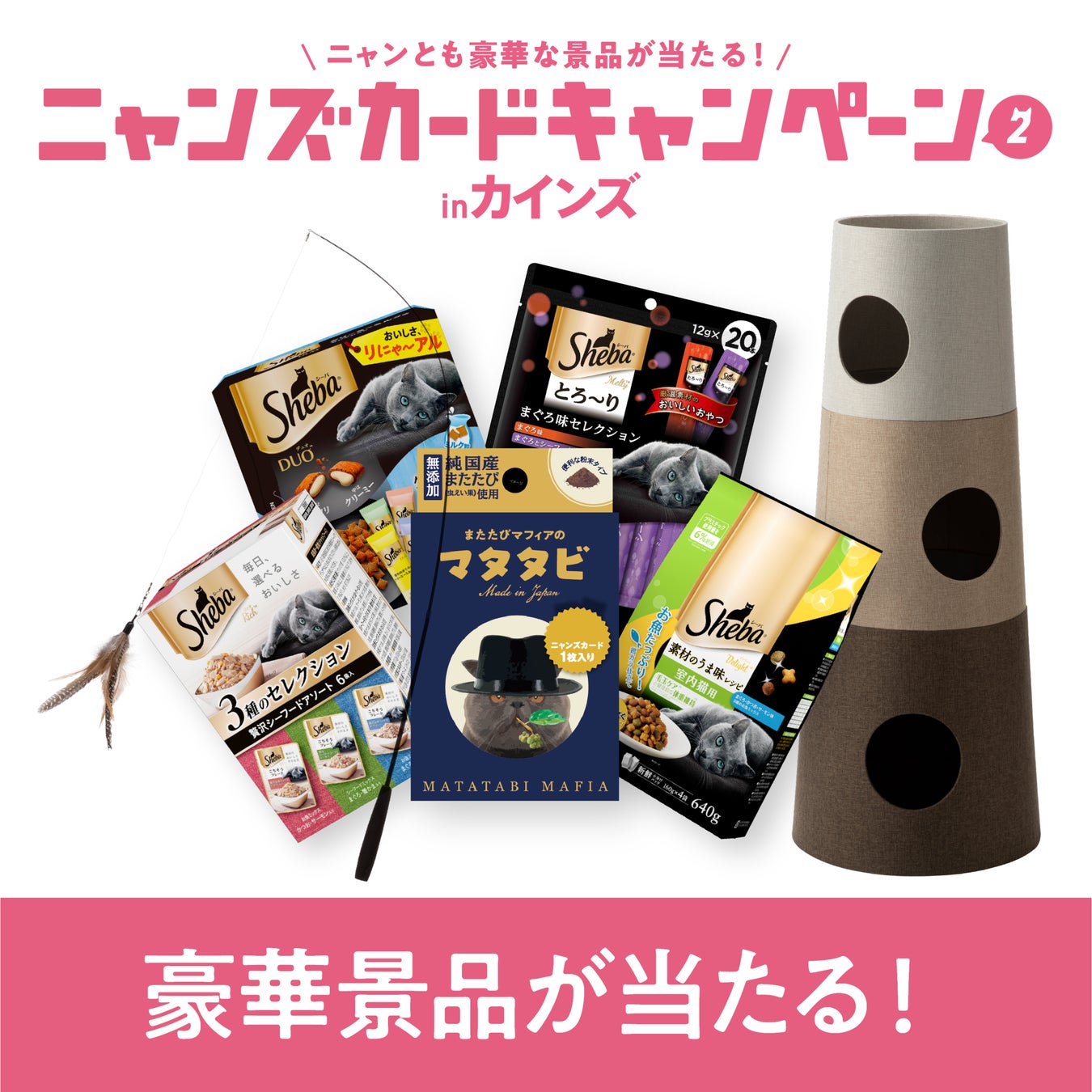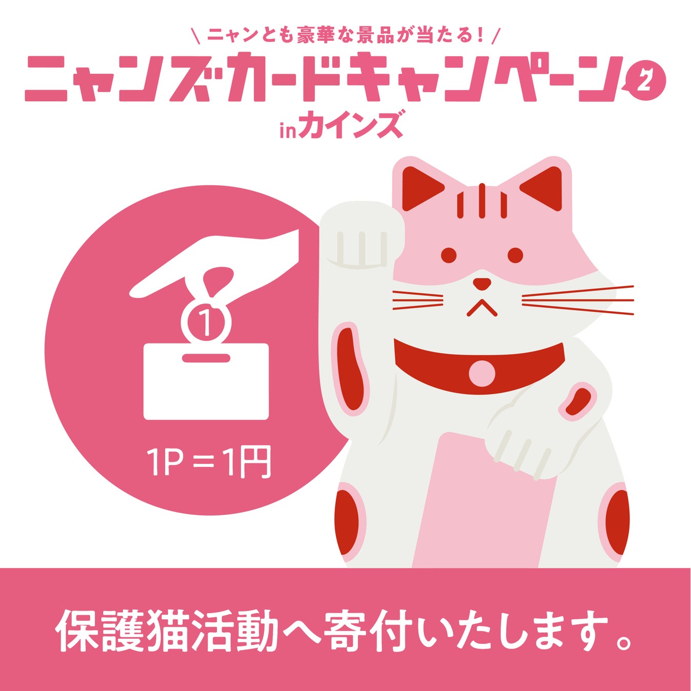 「ニャンズカードキャンペーンinカインズ2」は、対象商品に付属するニャンズカードのQRコードからポイントを貯めることで豪華景品が当たるプレゼントキャンペーンです。また、本キャンペーンと連動し、猫の保護活動をしている団体に、1pt=1円換算で寄付をします。
