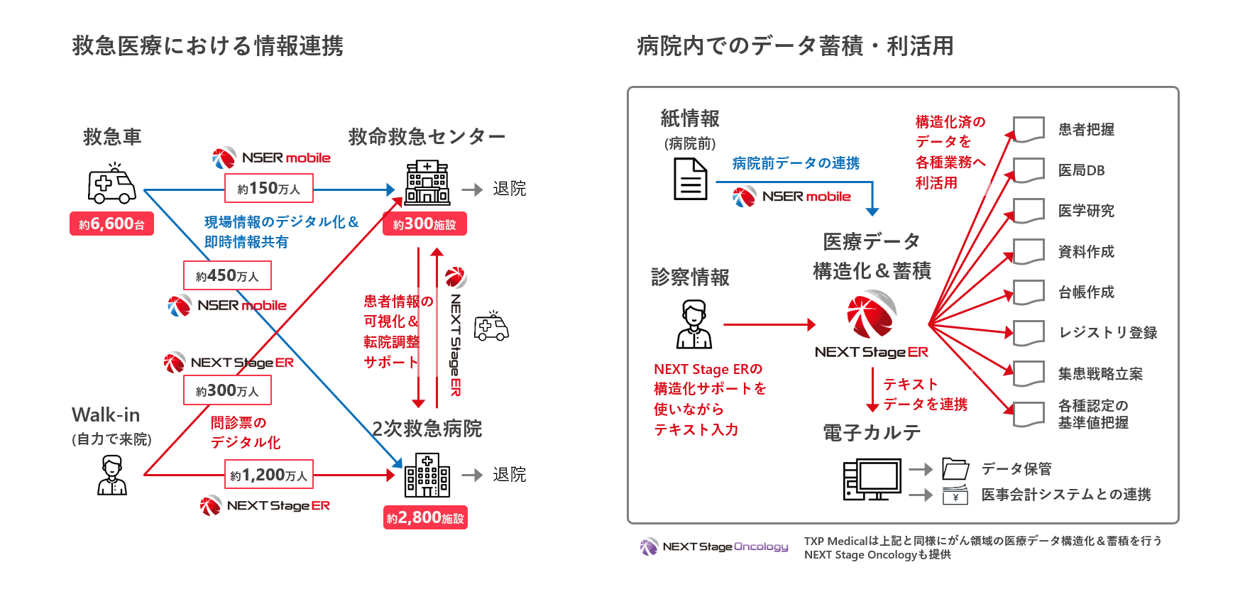 TXP Medicalは救急医療現場における医療情報の分断を解決する企業です。救急現場と病院間における情報のバケツリレー(紙・電話)をデジタル化し、病院の電子カルテ内の文章などの非構造化データを医学研究やその他業務に利用しやすい構造化データへ容易に変換するプロダクトNEXT Stage ERを病院向けに提供し、救急医療のデジタル化とデータに基づく医療の質改善を実現します。本プロダクトにより主訴や既往歴、臨床診断名、重症度スコアなどカルテテキスト内には存在するものの、文章の一部であるため利活用が困難であった詳細な医療データが活用可能となり、従来困難であった急性期領域における医療の質の可視化が実現されます。本プロダクトは救急搬送の受入数が多く、地域救急医療の要となる各地の救命救急センタークラスの大病院を対象としており、大学病院の救命救急センターセグメントではシェア20%を超え、蓄積される救急患者の情報は年間50万件を超えます。さらに、これらの病院と救急隊の即時情報連携を実現する入力支援AI機能を搭載したモバイルアプリNSER mobileを自治体向けに提供し、鎌倉市・豊田市など、全国での実利用を通じて適切な救急搬送先選定と救急搬送時間の短縮も実現しています。自治体や病院などのセグメントを横断したデータプラットフォーマーとして急性期医療の最適化を進めて参ります。