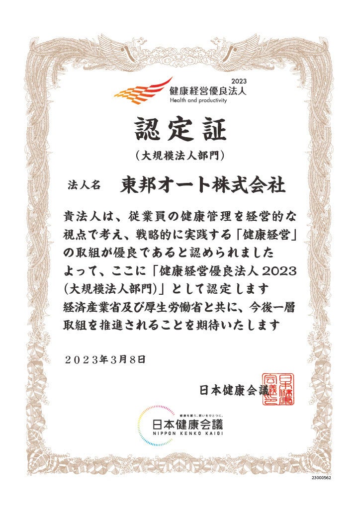 東邦オート・グループ3社「健康経営優良法人2023」(大規模法人部門)に認定