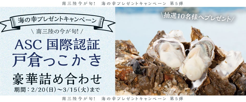 一般社団法人南三陸町観光協会(所在地:宮城県南三陸町、会長:及川吉則)は、ASC国際認証を取得した宮城県南三陸町産の牡蠣「戸倉っこかき」がもらえるプレゼントキャンペーンを開催いたします。2022年2月20日(日)~3月15日(火)までの期間、応募フォームから受付いたします。
